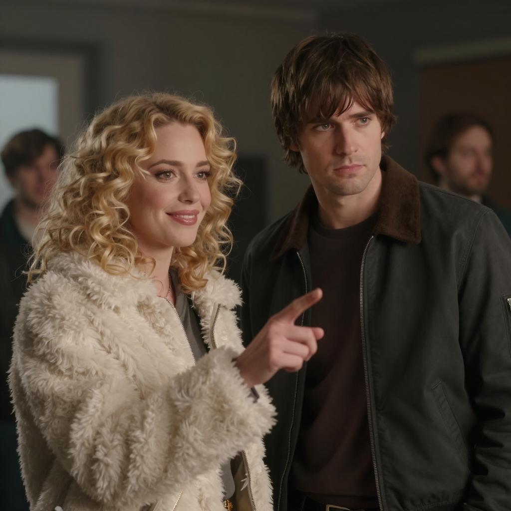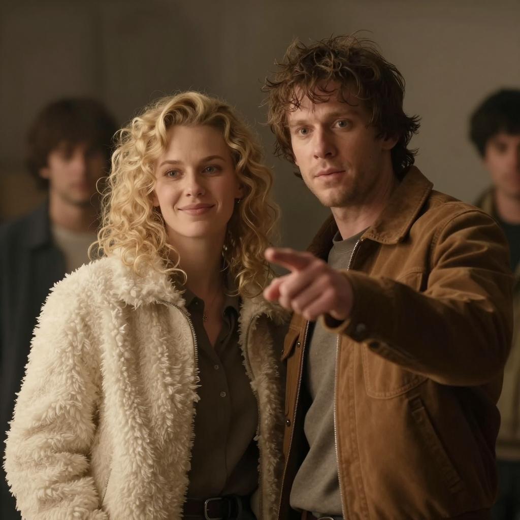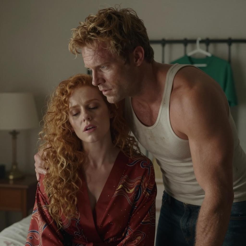 A bald man wearing a peach button-up shirt and black pants holds a roll of film in a dimly lit room. Next to him, a woman with curly blonde hair, dressed in a black top and a gold patterned skirt, holds a tray with multiple rolls of film. A vintage lamp with a cream shade illuminates the foreground. The background features shelves with various items and cardboard boxes, suggesting a workspace or darkroom environment.