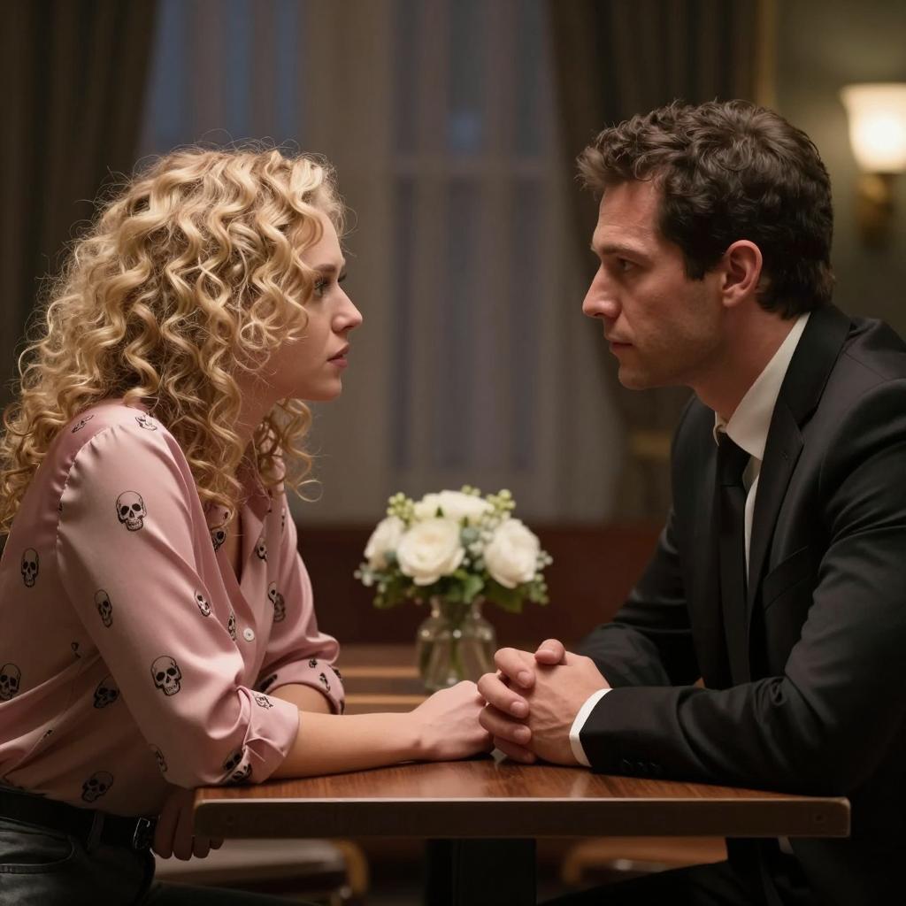 Two people in a dimly lit room. A man with a bald head, medium build, and light skin wears a peach shirt and black pants, holding a roll of film. A woman with curly blonde hair, medium build, and light skin wears a black top and gold patterned skirt, holding a tray of film. A vintage lamp with a cream shade is in the foreground on the left. Cardboard boxes and shelves with items are in the background. The woman stands to the right of the man. Both have intense expressions.