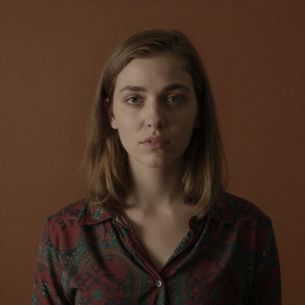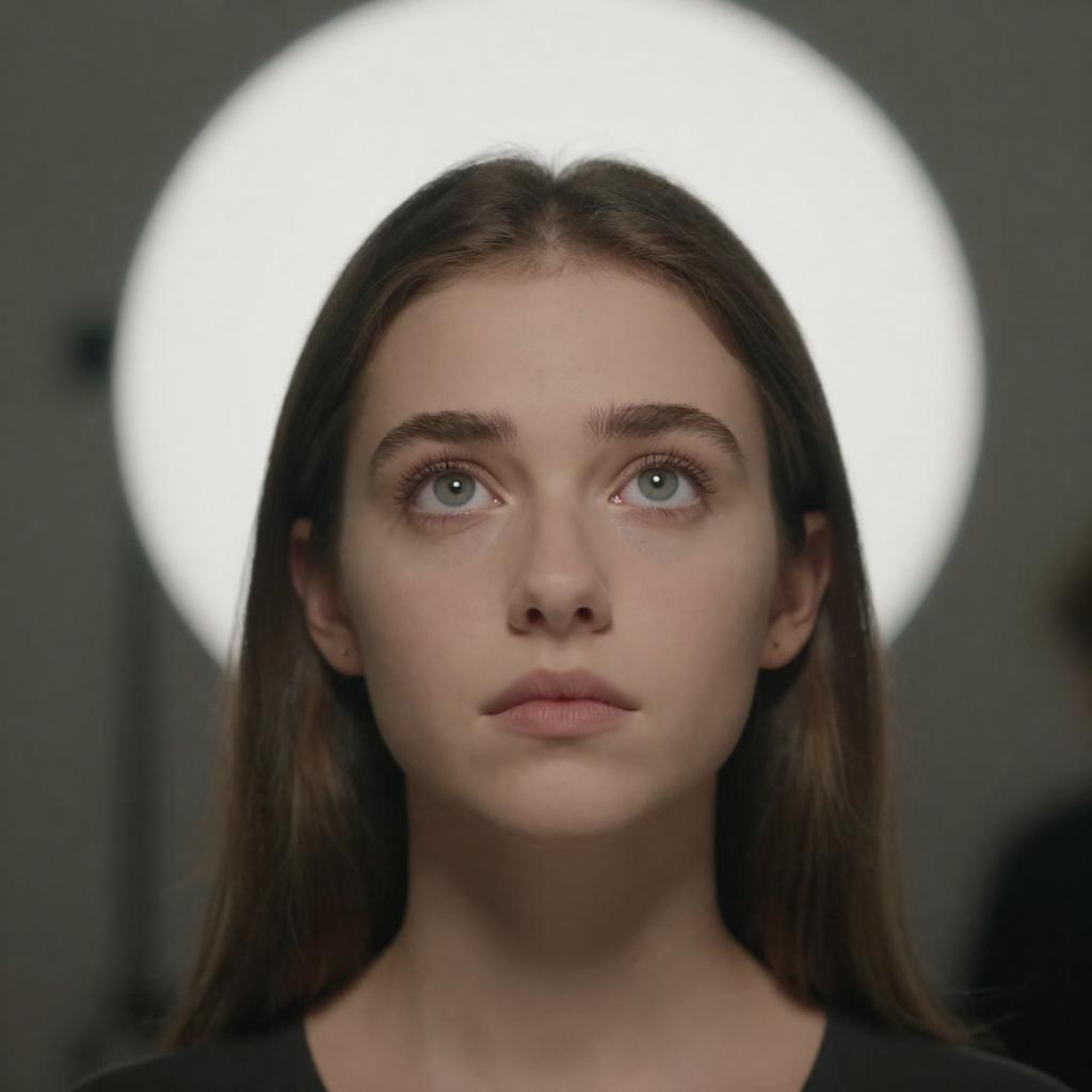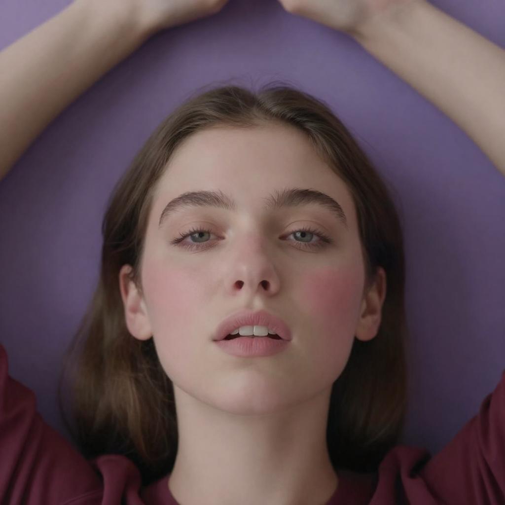 Photograph of a young woman with shoulder-length brown hair, wearing a red and green hoodie, leaning forward with hands on cheeks, looking up to the left. Blue and red lit background, white wall, and a white box-like object on the left. Her expression is curious and slightly surprised.