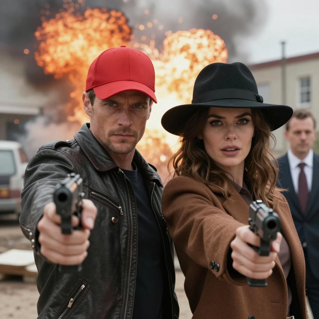 Photograph of a man and woman back-to-back, holding guns. Man with short brown hair, mustache, wearing blue and gray armored sleeves. Woman with curly blonde hair, intense expression, black top. Both look directly at camera. Dark background.