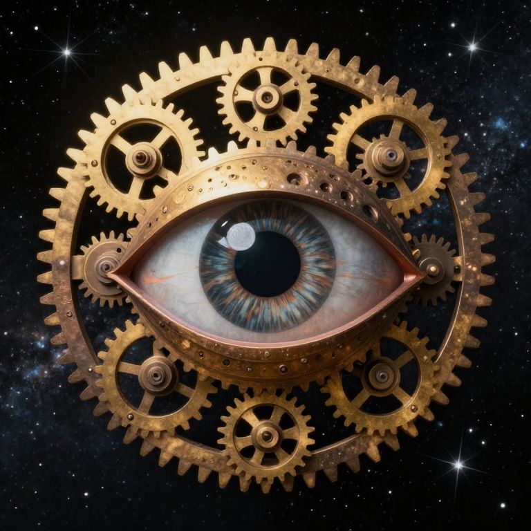 Digital artwork depicting a realistic, blue-and-white human eye at the center, surrounded by intricate, golden gears of various sizes. The gears are interlocked and appear to be floating in a dark, starry space background. The eye's iris is detailed with fine lines, and the pupil is black. The gears have a metallic texture, with visible teeth and small bolts. The overall style combines elements of steampunk and surrealism, creating a futuristic, cosmic effect. The background is filled with small, sparkling stars, enhancing the otherworldly atmosphere.