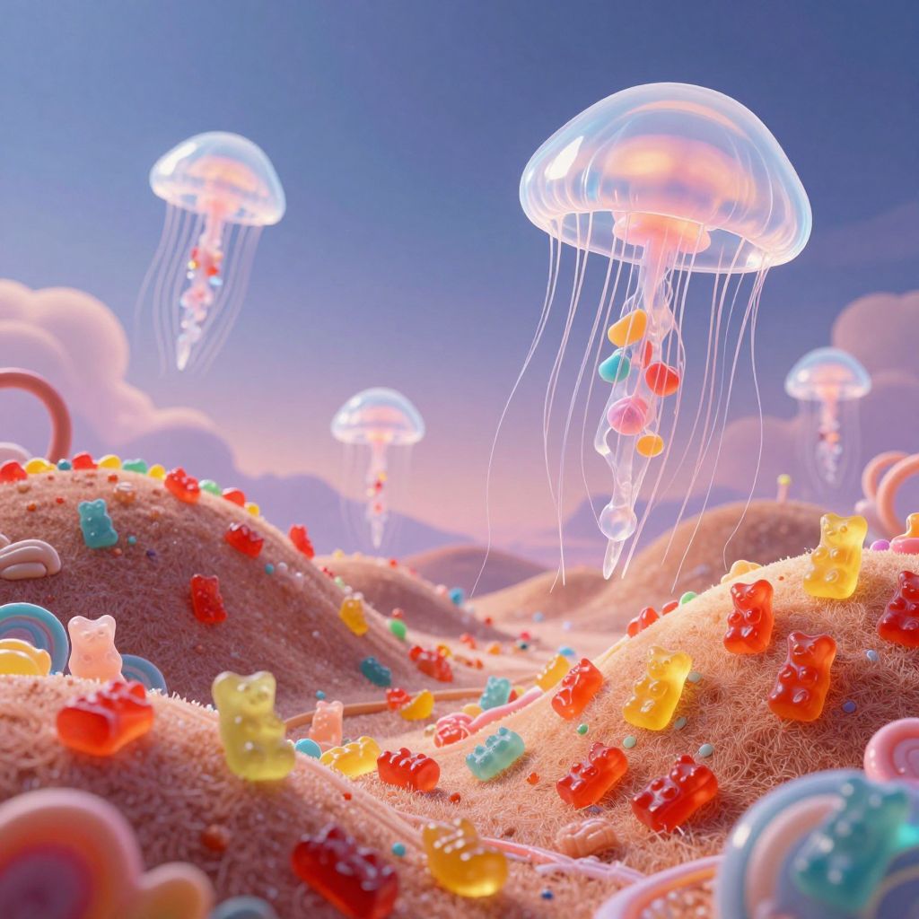 In a whimsical dreamscape where rolling hills of vibrant gummy bears pulse with life, giant jellyfish drift serenely, their translucent forms bathed in the soft glow of a surreal sky, evoking a sense of wonder and childlike joy amidst the transient beauty of a candy-colored world.