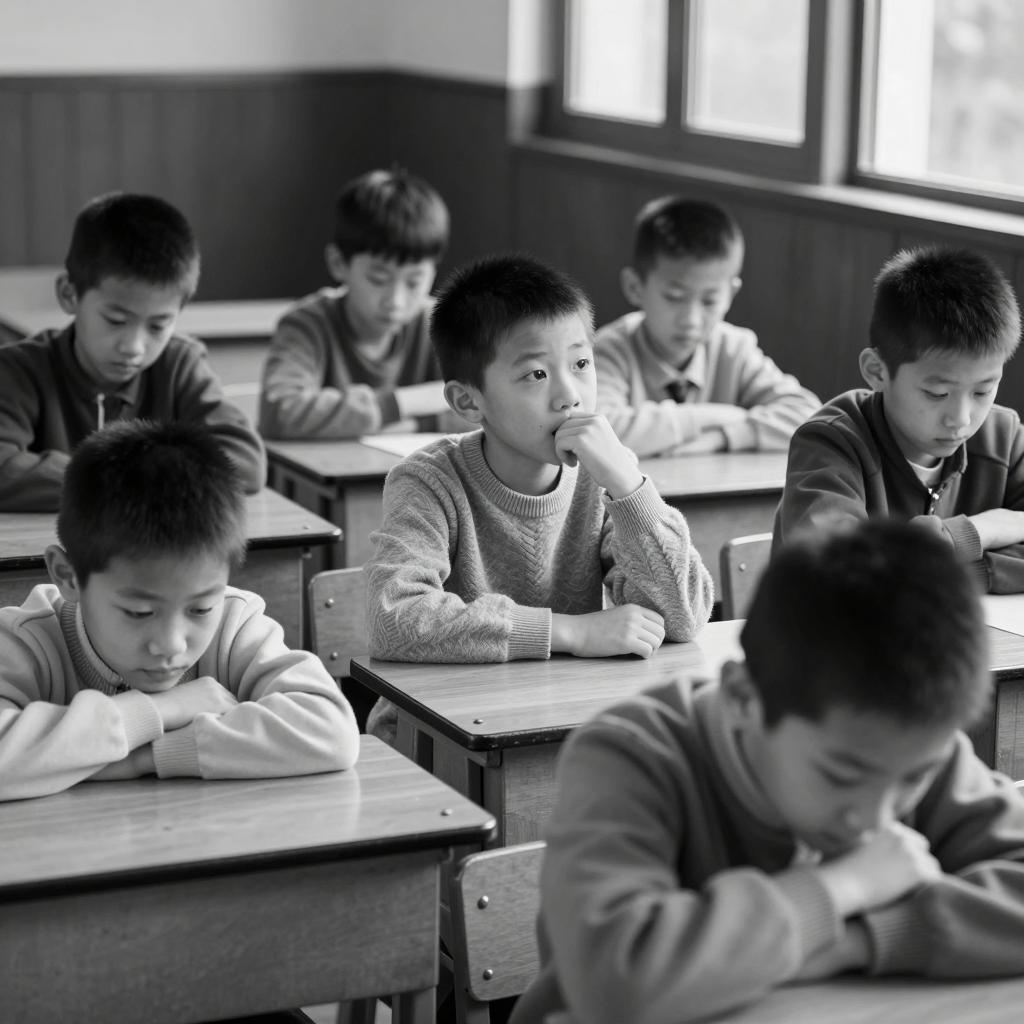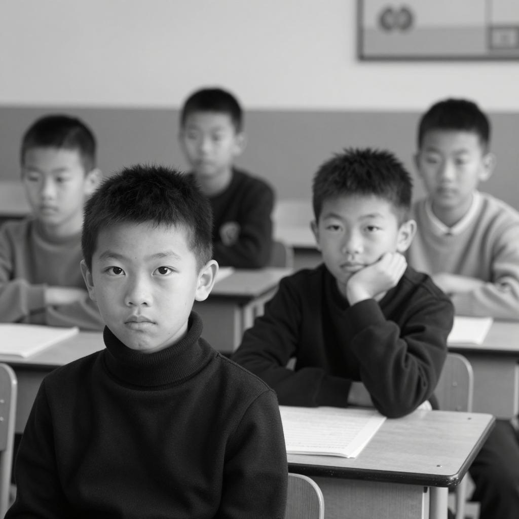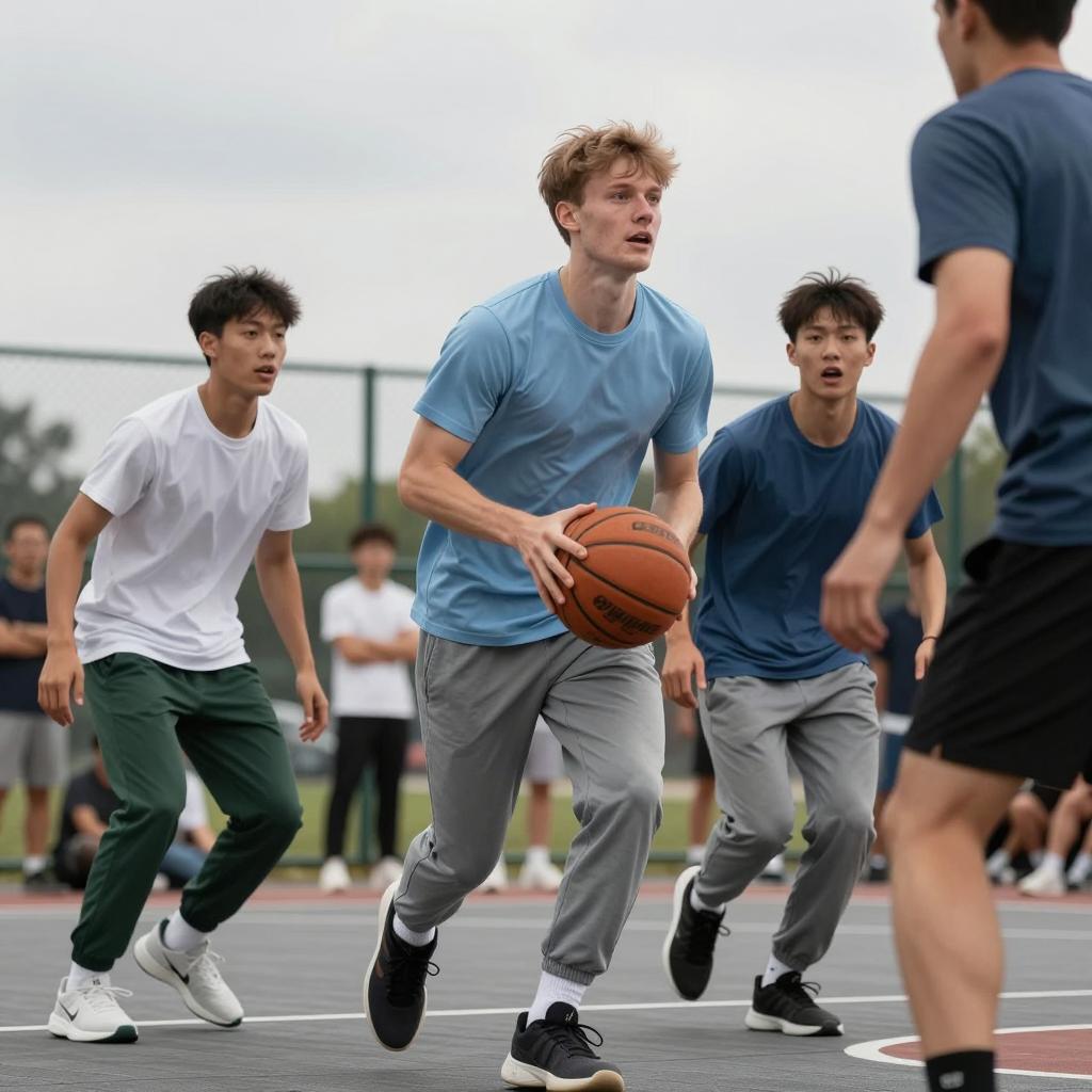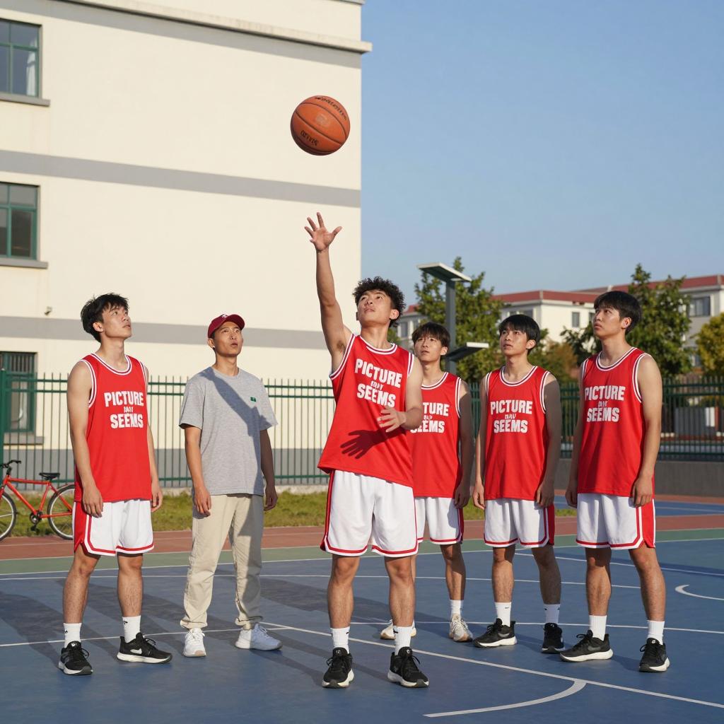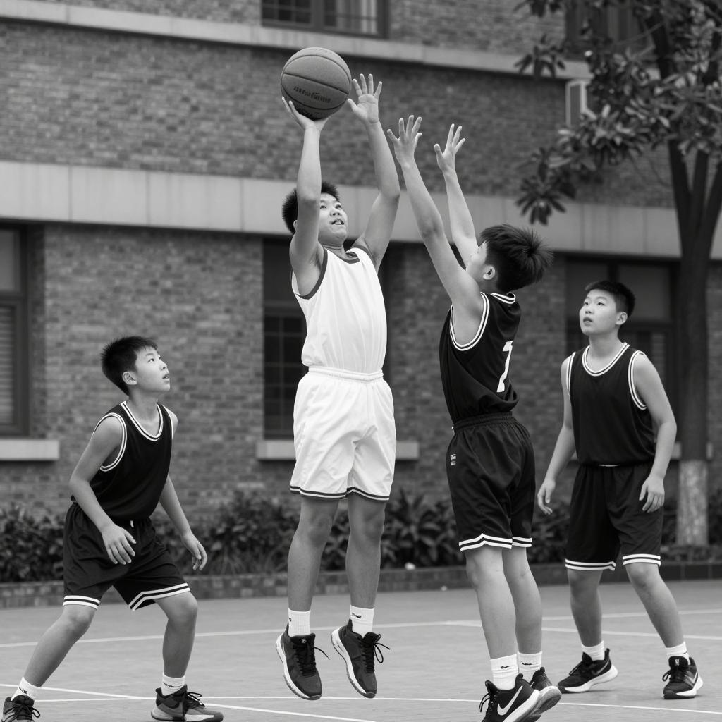 Black and white photograph of four boys playing basketball outdoors. One boy in white jumps to block a ball, two boys in dark clothes reach up, and a boy in a dark shirt watches. Brick building and tree in background. Boy on left in foreground. Dynamic poses, intense expressions.