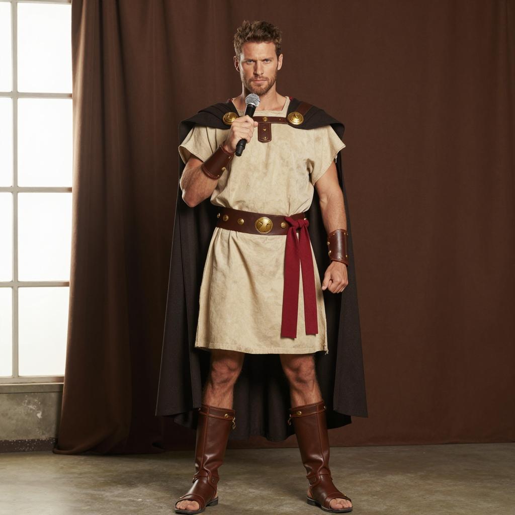 Present mic costume, photograph of a man standing in a dimly lit room, wearing ancient Roman-style attire, beige tunic, brown belt, red sash, black cloak, brown boots, holding a microphone, serious expression, brown curtain in background, natural light from window on left, medium shot, realistic style, slightly warm color tone
