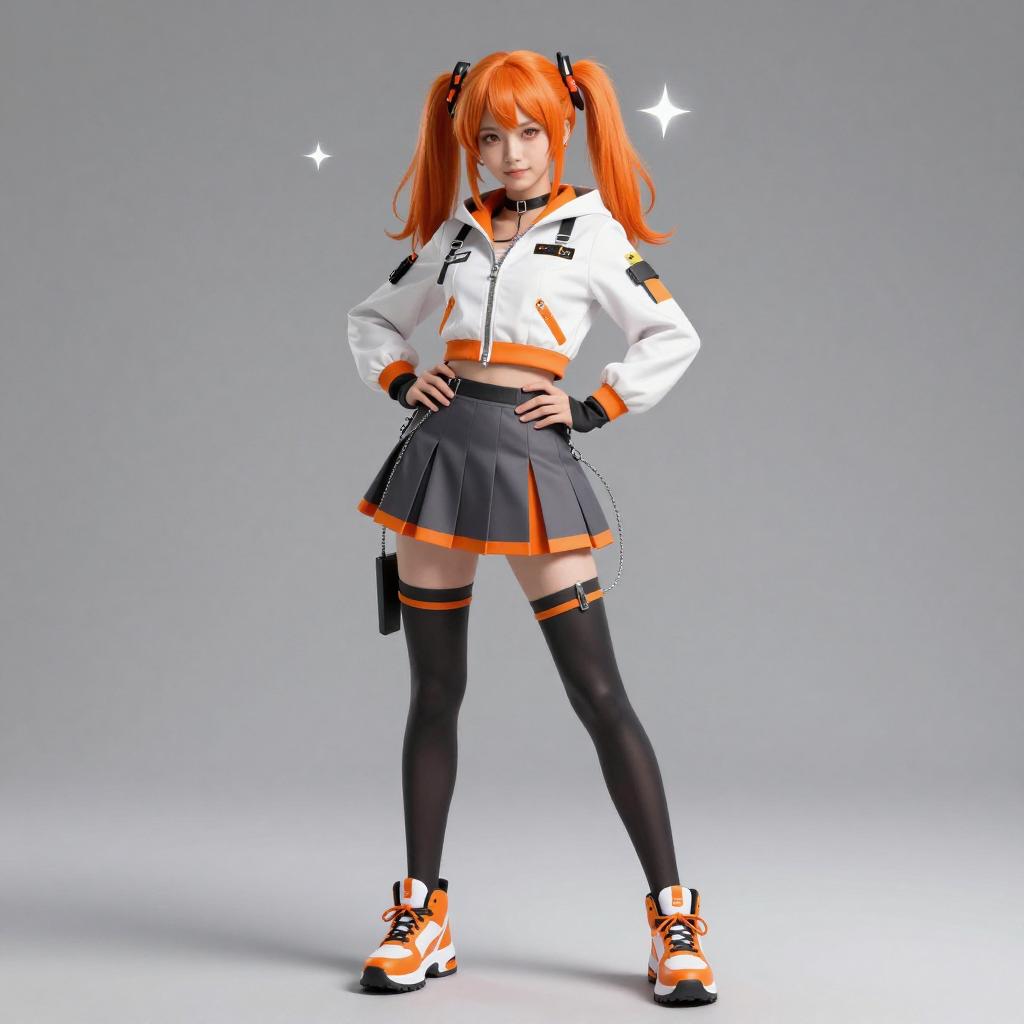 Digital artwork of a confident anime girl with bright orange twin tail hair. She wears a white cropped jacket with orange accents, a gray pleated skirt with orange trim, black thigh-high leggings featuring orange details, and matching orange and white sneakers. The girl poses boldly with one hand on her hip, with cables hanging from her outfit. The background is a simple gray gradient with two sparkle effects near her head.