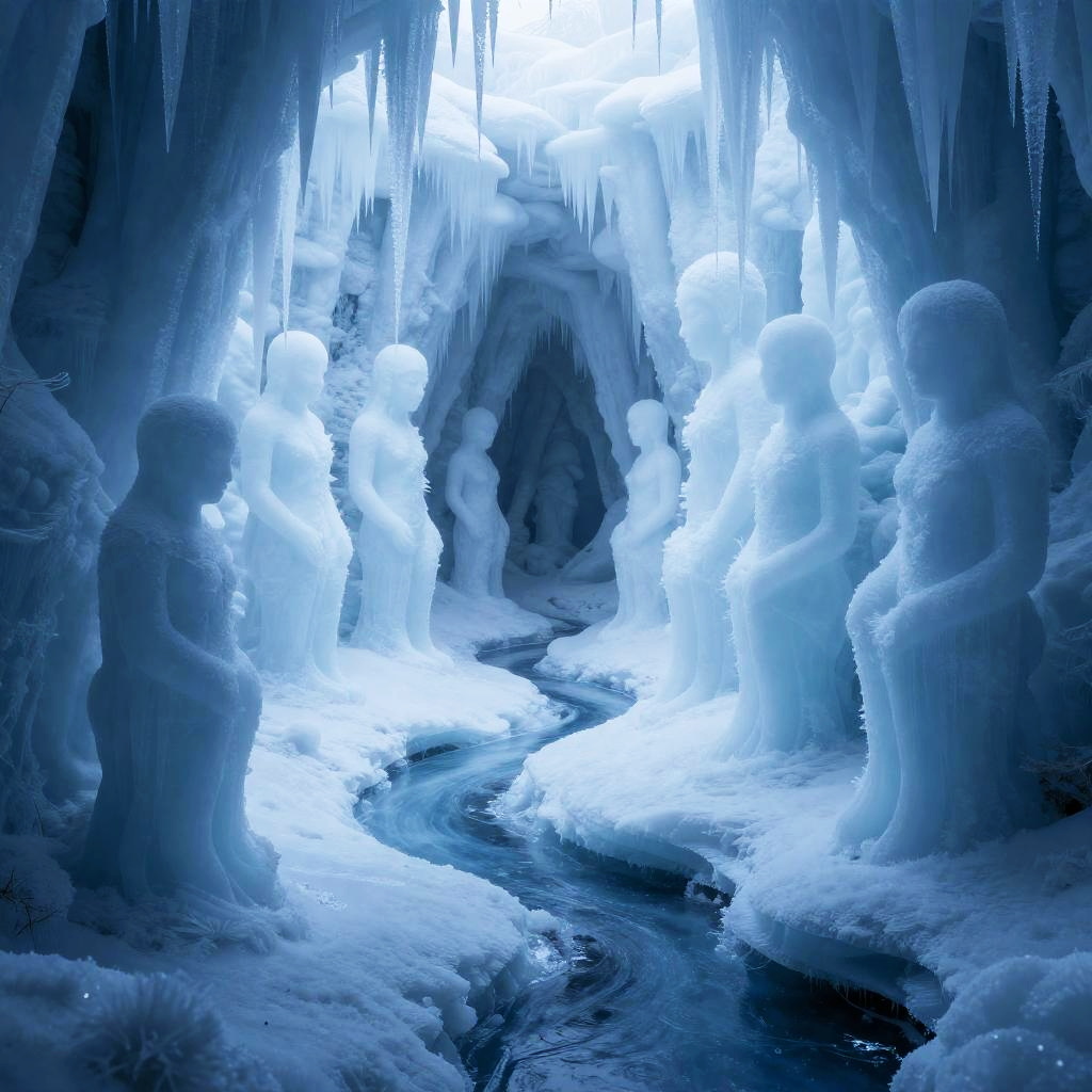 A surreal fantasy scene of a frozen landscape filled with intricate textured ice formations resembling abstract figures gathered around a winding icy stream, ethereal soft blue and white lighting illuminating the scene, deep blue shadows enhancing the cold and mystical atmosphere, detailed icy textures and delicate icicles hanging from above