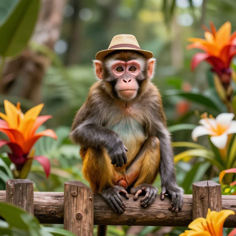Monkey with no teeth wearing a small hat, perched on a vintage wooden fence, colorful jungle flowers around, playful and charming atmosphere, vivid details and warm natural lighting