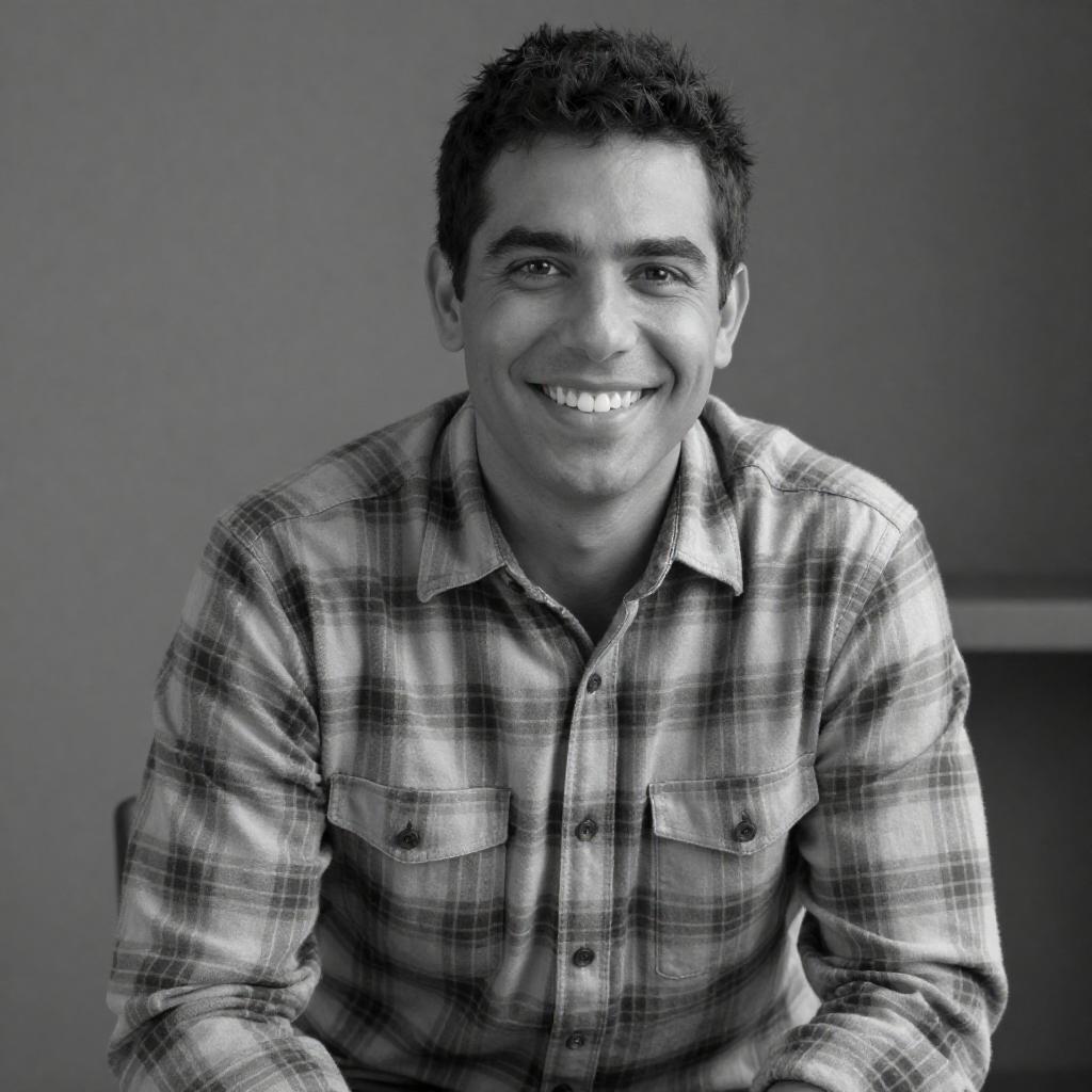 Black-and-white photograph of a smiling man with short, dark hair, wearing a plaid button-up shirt with chest pockets. He is slightly turned to the right, looking off-camera. The background is blurred, focusing attention on his face and shirt. The image has a high-contrast, grainy ure.