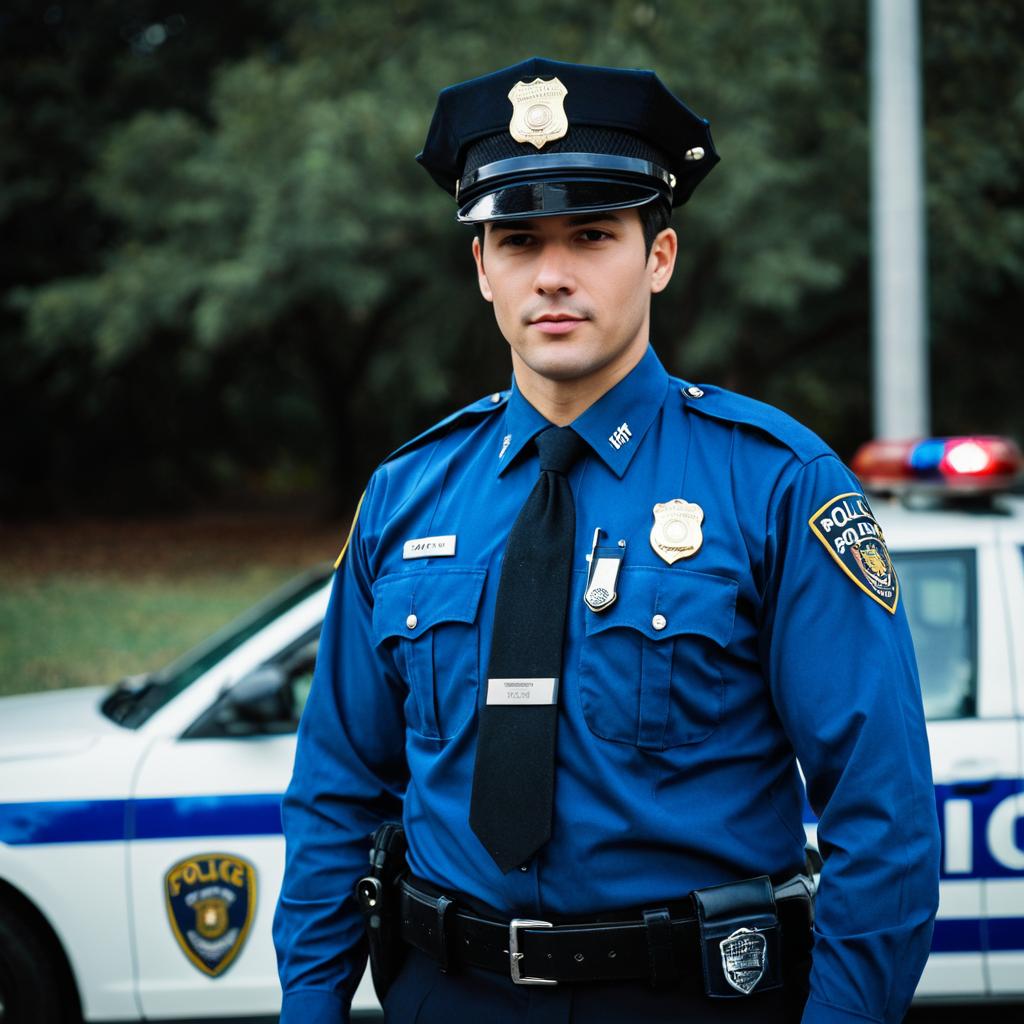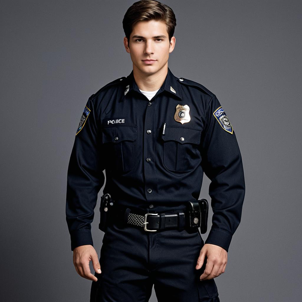 Navy coveralls,1boy, male focus, solo, realistic, hat, uniform, hand in pocket, police, looking at viewer, police uniform, pants, pocket, grey background, closed mouth, cowboy shot, simple background, blue pants, shirt
