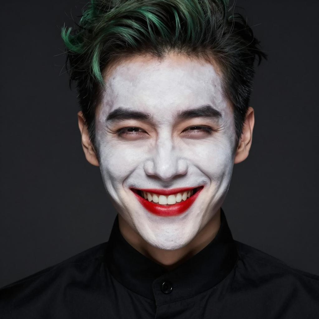 Three people. Top: white-skinned male with white face paint, black hood, smiling, red eyes. Right: Asian woman with black hair, smiling. Bottom: white-skinned man with red cap, wincing, hands raised. White background. All have raised hands.