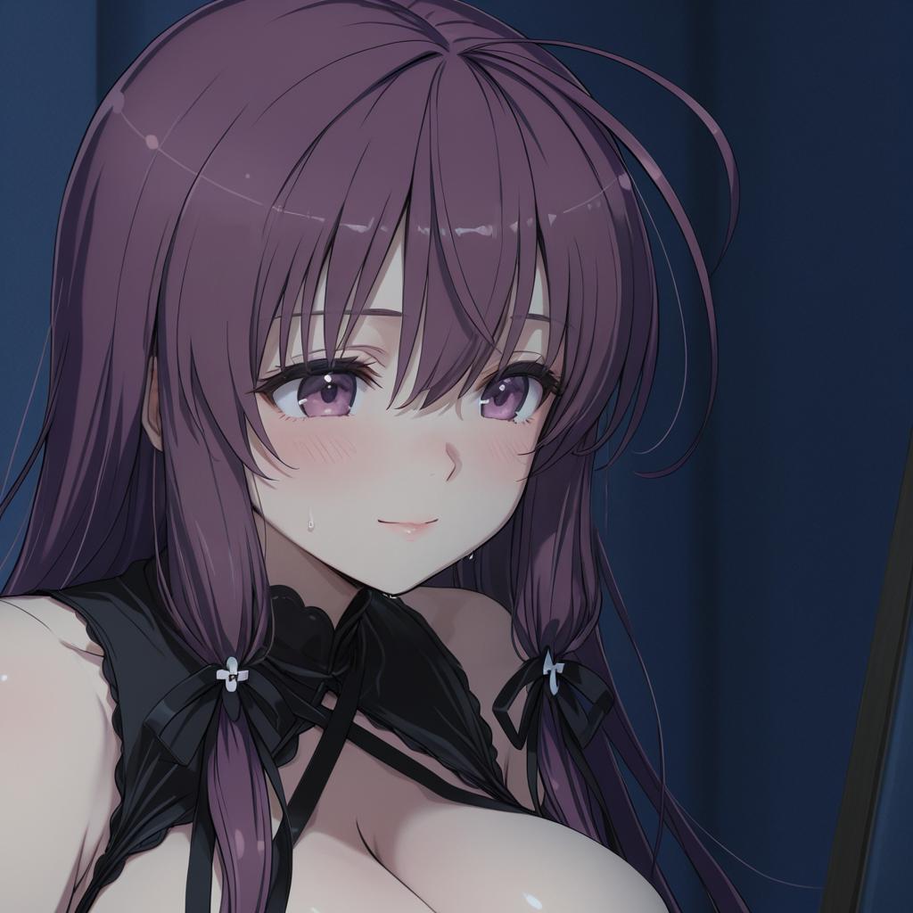 This digital anime-style illustration features a close-up of a young woman with long, straight, purple hair and large, purple eyes. She has a fair skin tone with a slight blush on her cheeks. She is wearing a black, strappy, revealing top that exposes her cleavage and has small, black ribbon details with white crosses. Her expression is soft and slightly shy. The background is a dark, gradient blue, adding contrast to her lighter skin and hair. The image has a glossy, smooth texture, typical of digital artwork, and the lighting highlights her hair and eyes, giving a soft, glowing effect.