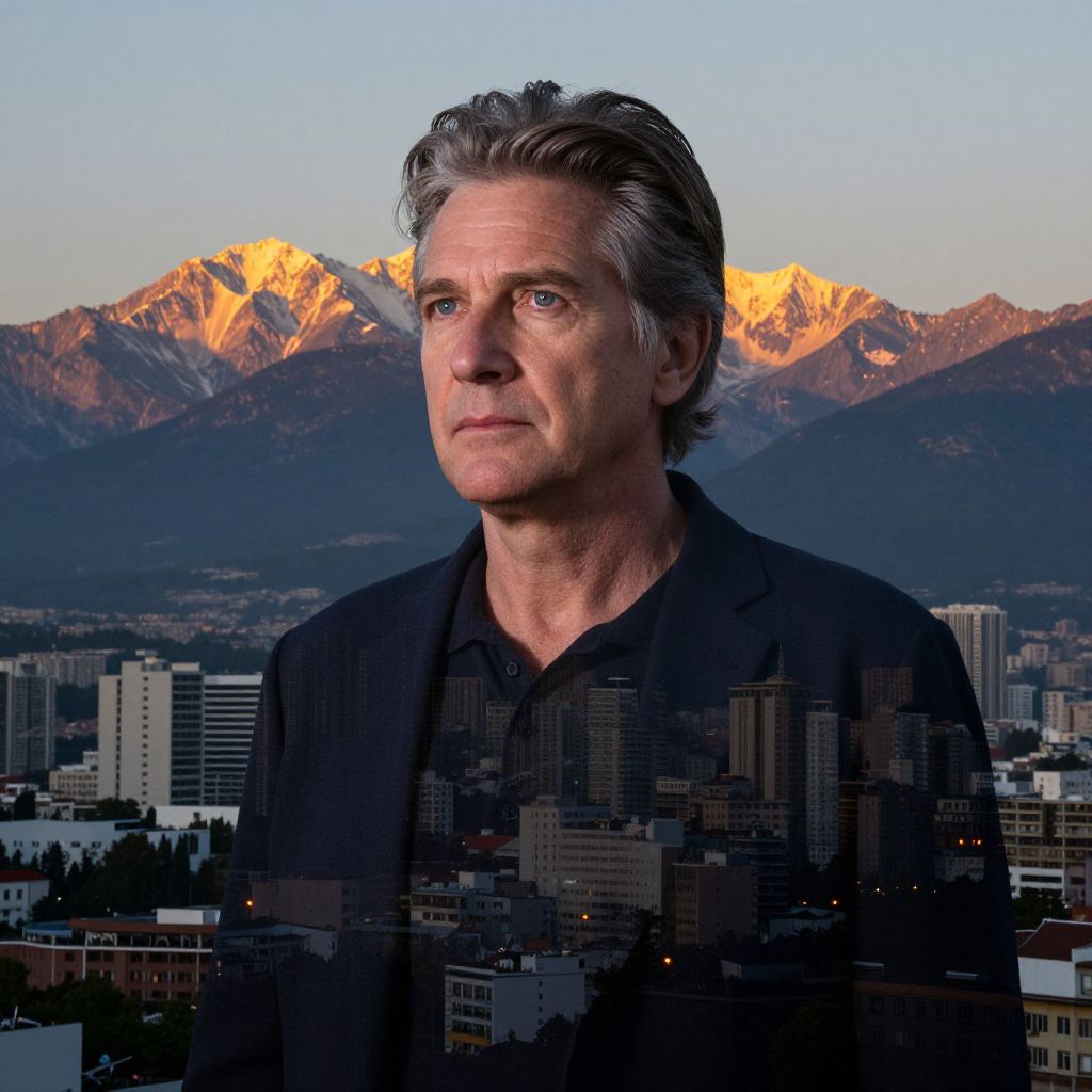 A digital photograph of a middle-aged Caucasian man with gray, wavy hair and blue eyes, wearing a black shirt. He stands against a backdrop of a cityscape with illuminated, snow-capped mountains at sunset. The mountains' golden hues contrast with the dark city buildings below. The man's expression is serious, and his skin has a slightly weathered texture. The image blends realistic photography with digitally added elements, creating a juxtaposition between the man's human form and the dramatic natural and urban landscape behind him.