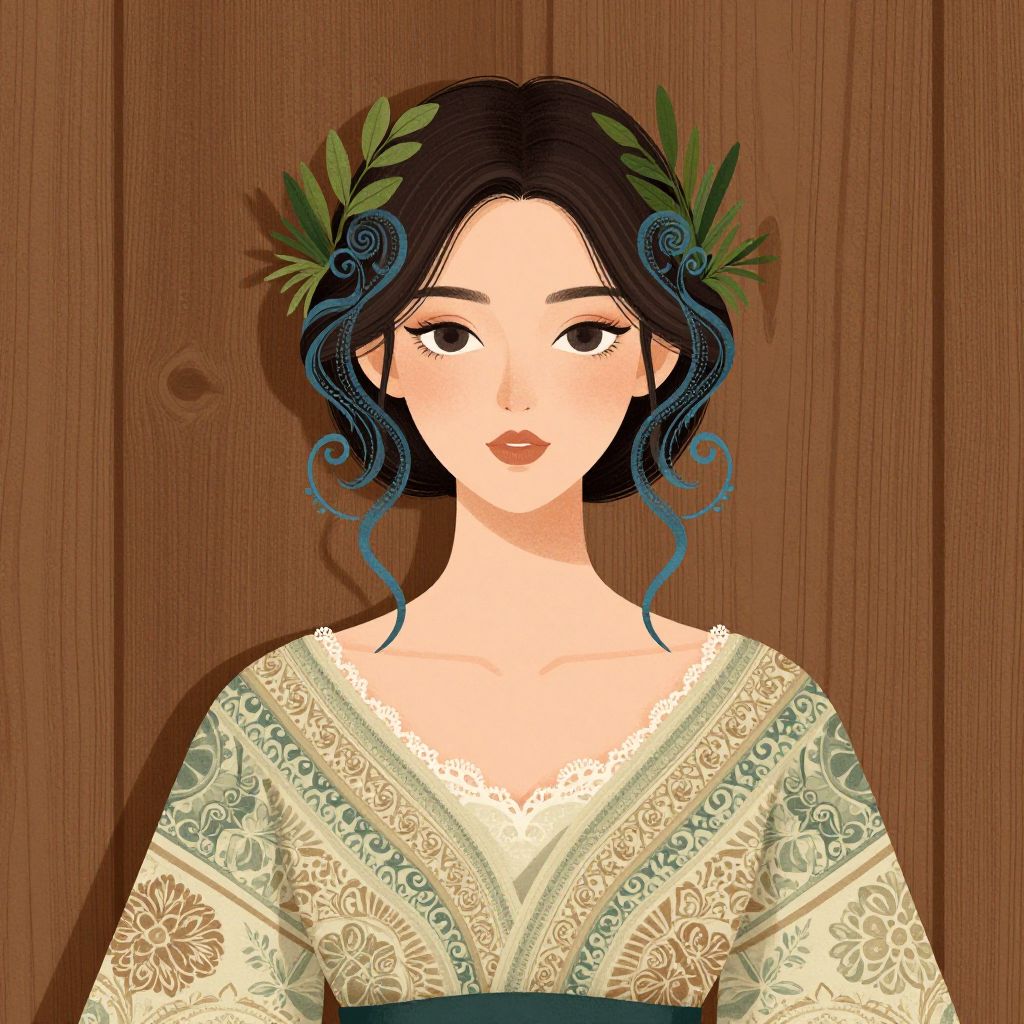 Elegant illustration featuring a woman with dark hair adorned with green foliage and intricate blue swirls, set against a wooden backdrop, showcasing detailed patterns and a vintage-inspired dress.