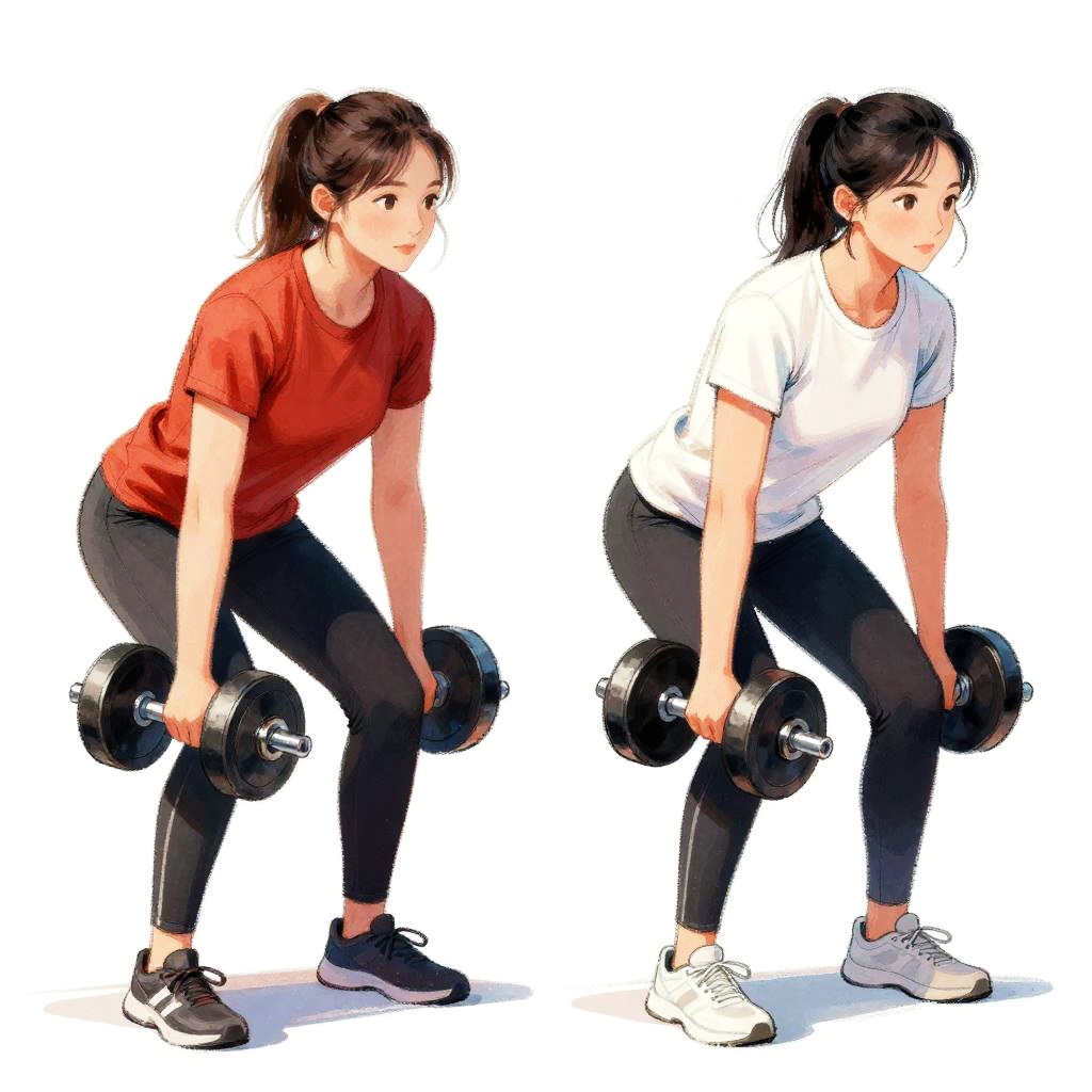 This digital drawing features two blurred, semi-transparent figures in a gym setting, each performing a bent-over weightlifting stance. The figures have black hair and are wearing red and white shirts, along with black pants. They both have large black dumbbells in each hand. The background is plain white, and the drawing has a sketch-like, unfinished quality with visible brushstrokes and a watercolor effect.
