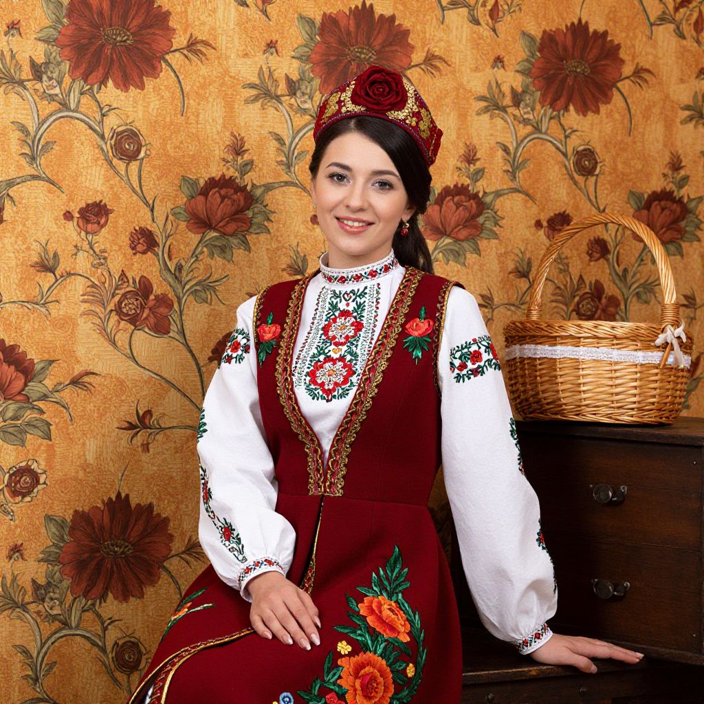 Photograph of a young woman with fair skin and dark brown hair, styled in a bun, wearing a traditional Eastern European folk dress. The dress is red with intricate black and white floral embroidery and a white blouse with puffed sleeves underneath. She also wears a matching red floral headscarf. The background features a yellow floral wallpaper with large red flowers. To her right, there's a dark wooden table with a wicker basket on it. She is seated and smiling gently at the camera.