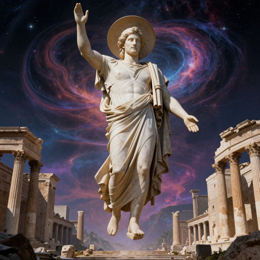 Elagabalus depicted in surreal dreamscape, floating amidst ancient Roman architecture and swirling cosmic elements, vibrant colors with a hint of darkness, a fusion of historical and fantasy themes, atmospheric concept art