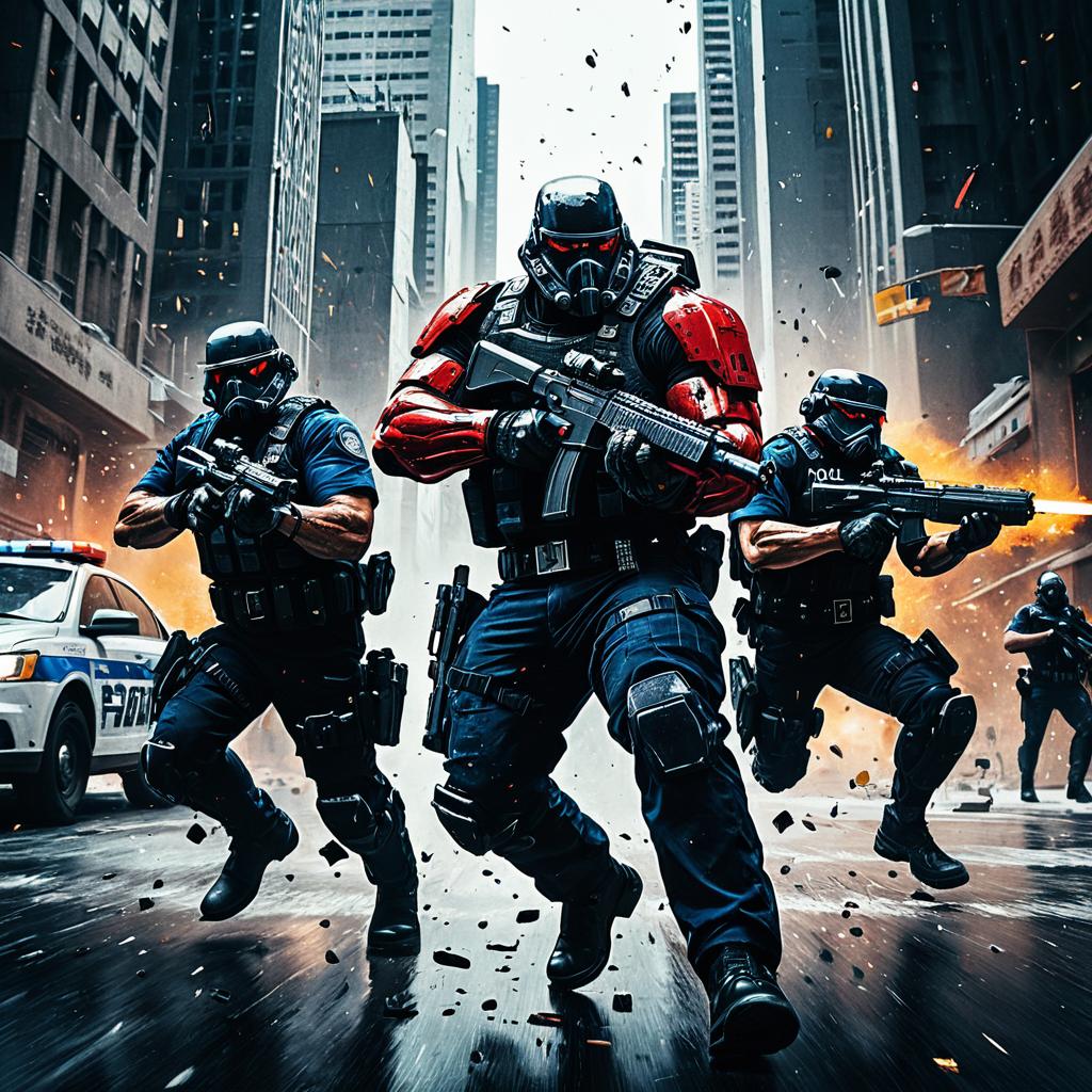 Cyberpunk cartel assassin evading hulking police troopers, splash art with high-contrast colors, by Khyzyl Saleem, highly detailed, dystopian, Greg Rutkowski style