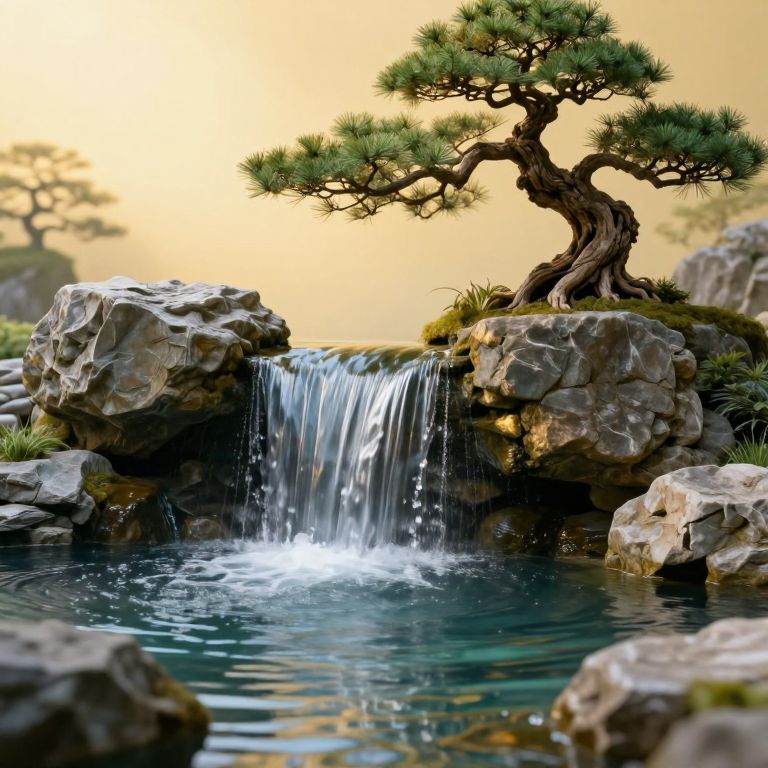 A serene digital art masterpiece captures the tranquil essence of a Zen garden, reminiscent of cascading water scenes. From a low-angle perspective, we observe an ethereal waterfall flowing over weathered stones, creating delicate ripples in the pool below. An ancient bonsai tree stands majestically at the edge, its gnarled branches reaching towards the heavens. Soft, golden light gently illuminates each element, evoking a sense of peace and contemplation. The vivid colors and intricate details harmoniously blend to create an immersive experience, transporting viewers into a realm where nature's simplicity meets spiritual enlightenment.