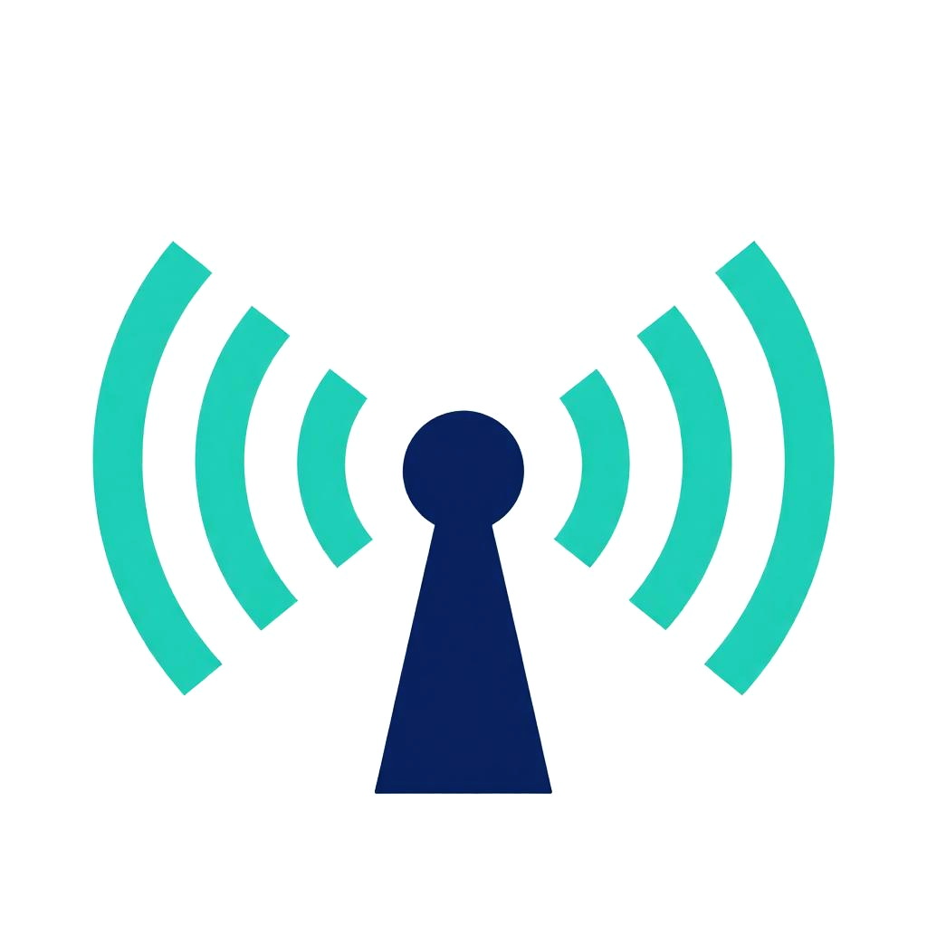 Digital graphic of a solid dark blue keyhole icon centered on a white background. Radiating from the keyhole are five semi-circular, aqua-blue lines, evenly spaced to represent radio waves. The keyhole is simple and symmetrical with a circular top and a triangular bottom. The aqua-blue lines are bold and evenly spaced, giving a clear signal-like appearance. The overall style is minimalistic and modern, using flat colors and clean lines.