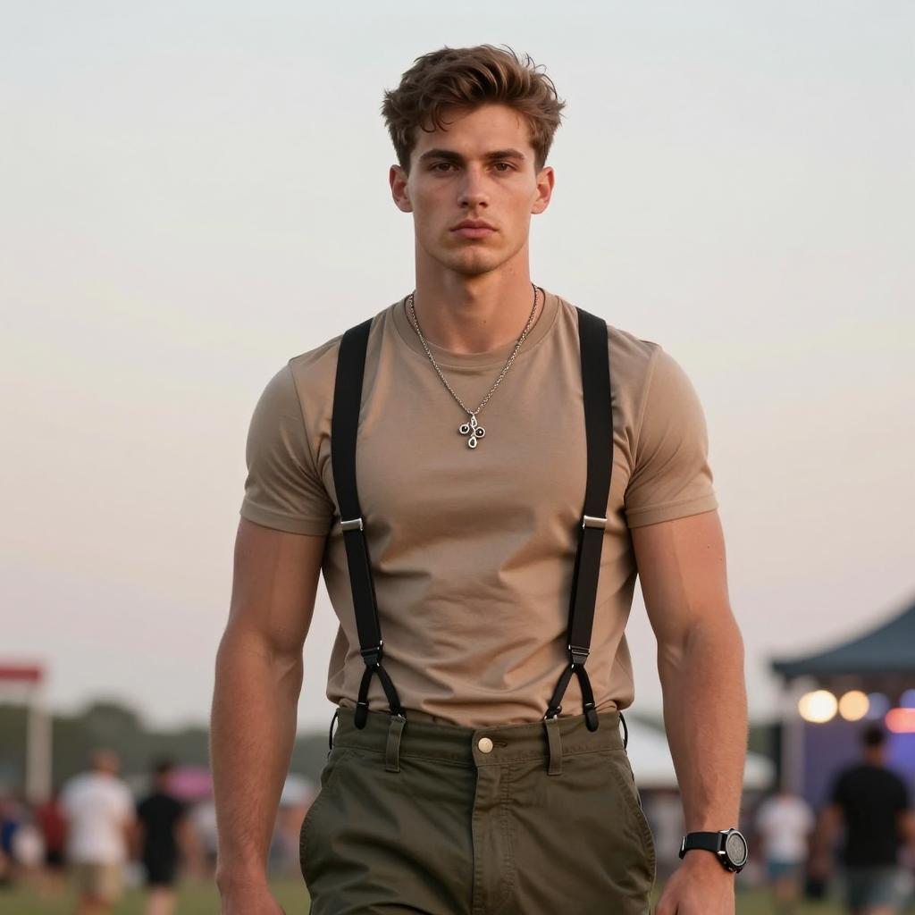 Bootcut jeans man costume, photograph of a muscular man standing outdoors, shirtless, wearing blue jeans with brown suspenders, hands in pockets, belt with large silver buckle, short brown hair, slight beard, clear blue sky, background includes blurred building and person in yellow shirt, daytime, sunlight casting shadows, strong and confident expression, realistic, high quality