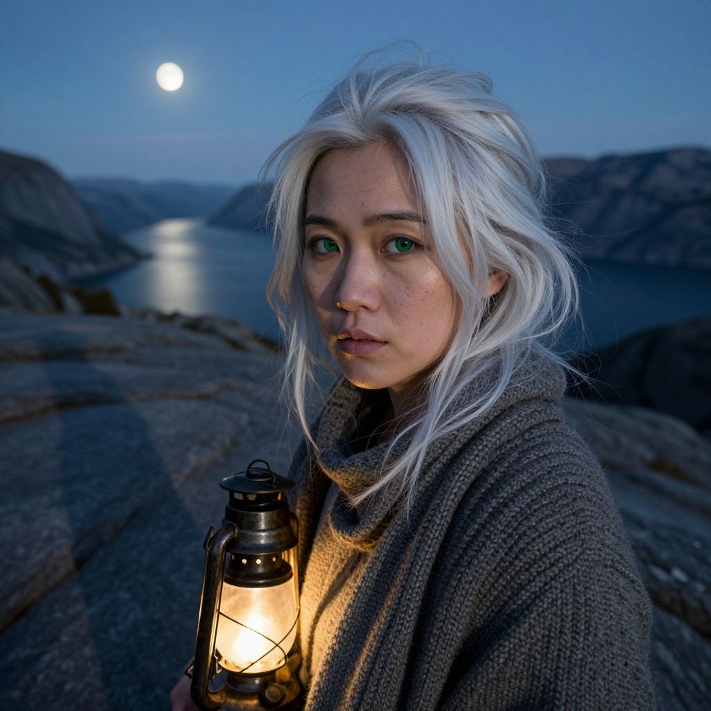 Create a super-realistic portrait of an East Asian woman with piercing green eyes, snow-white hair, and fair skin. She stands amidst a rugged terrain, posed against a serene backdrop of a moonlit fjord. The soft glow of her lantern casts long shadows across the rocky landscape, illuminating her weathered face from an elevated angle. This lighting highlights the delicate interplay between light and shadow, accentuating the resilient character lines etched into her skin. Captured in a moment of introspection, the scene evokes a sense of nostalgia, capturing both the timeless beauty and rich history woven into her captivating presence.