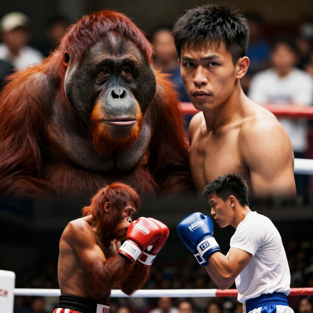 Photograph of a man with dark hair, intense expression, standing next to a large orangutan with a curious expression. Below, a shirtless man and another man in a white shirt engage in a boxing match. Crowd in background. Bright lighting.