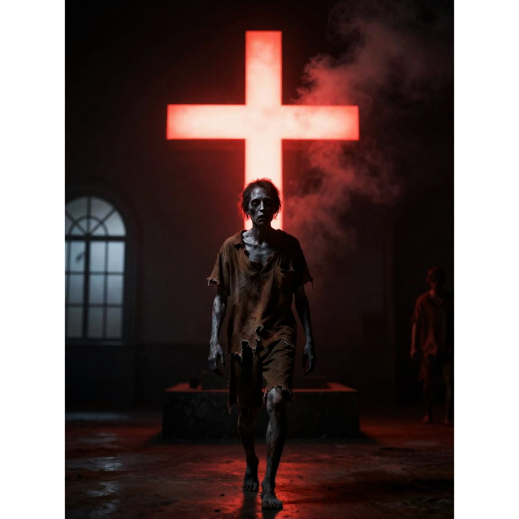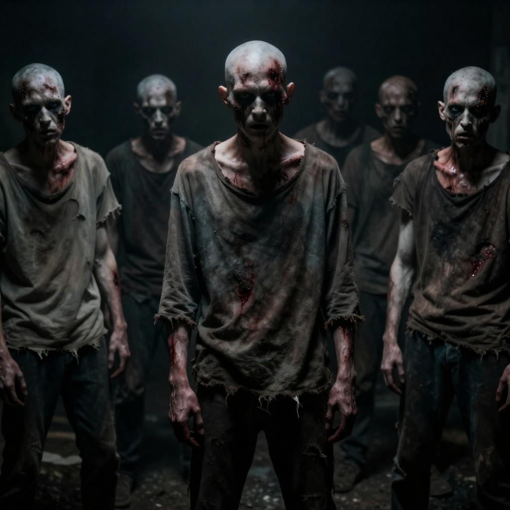 Group of six emaciated, bald, zombie-like men with scarred faces, wearing tattered clothes, standing in a dark, grimy setting. They have intense, vacant expressions, hunched postures, and bloody wounds. One man in center has a prominent head scar.