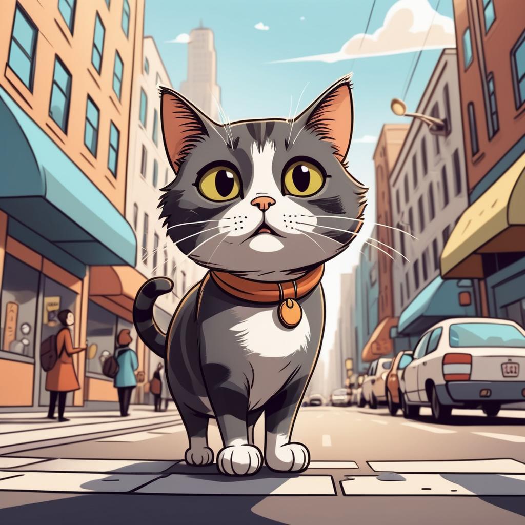 A curious cat is caught in a bustling city street, completely bewildered, with eyes wide in surprise, illustrated in cute cartoon style.