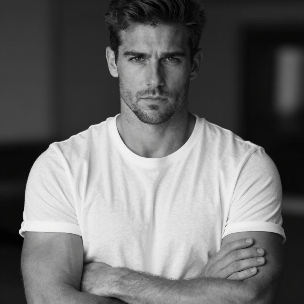 Photograph of a muscular, handsome man with short brown hair and blue eyes, wearing a tight black t-shirt. He's standing outdoors with a blurred, green, and cloudy background. The lighting is natural, with soft shadows. The camera angle is slightly below eye level, and the depth of field keeps the man in sharp focus while the background is blurred.