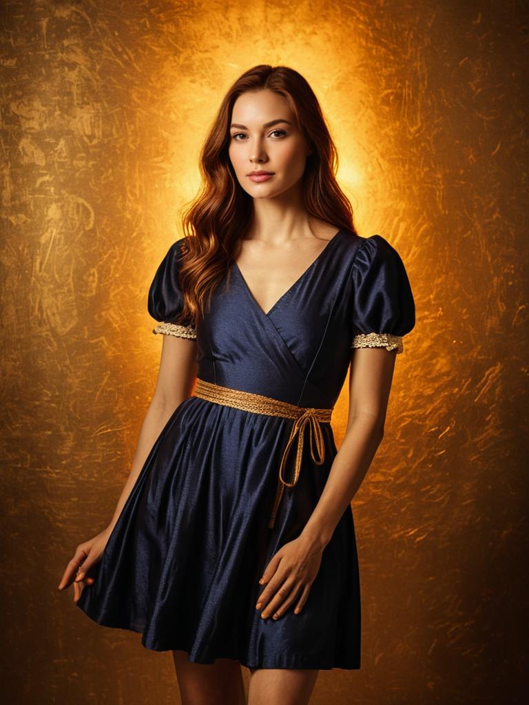 Porter clothing costume, photo of young woman, standing, full body, dark brown wavy hair, neutral expression, wearing traditional dark blue dress, puffed sleeves, lace-up corset front, red floral embroidery on skirt, white collar with red ribbon, plain gray background, realistic style, soft lighting, no accessories, dress has brown and red trim, model facing camera, medium shot, portrait orientation