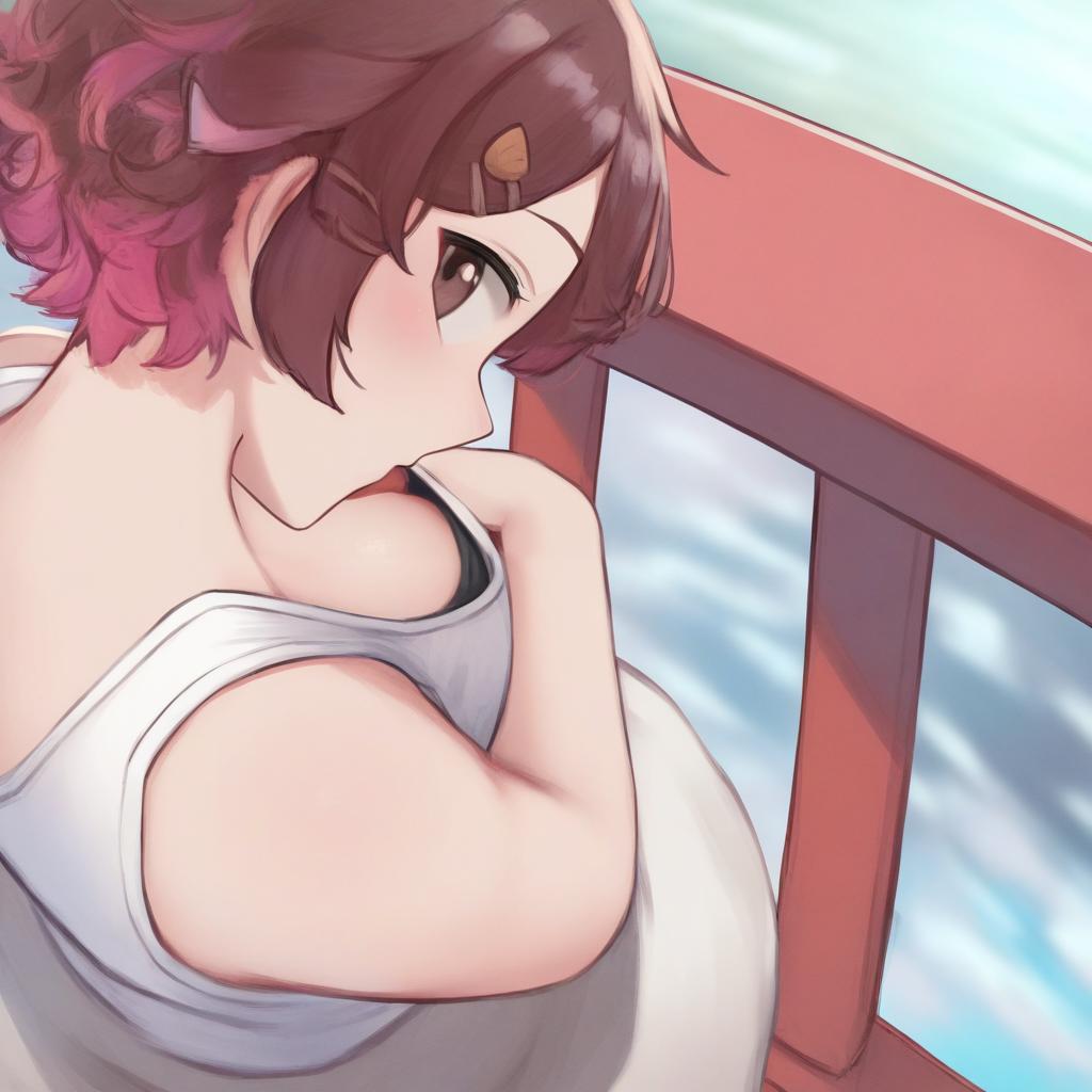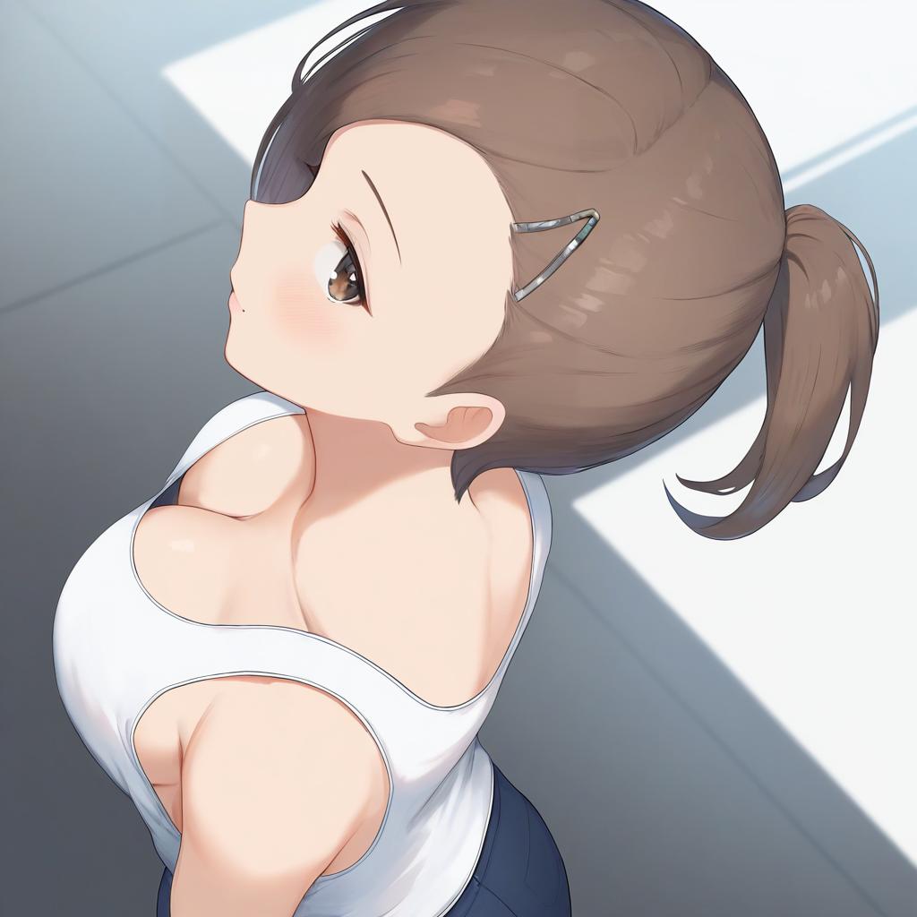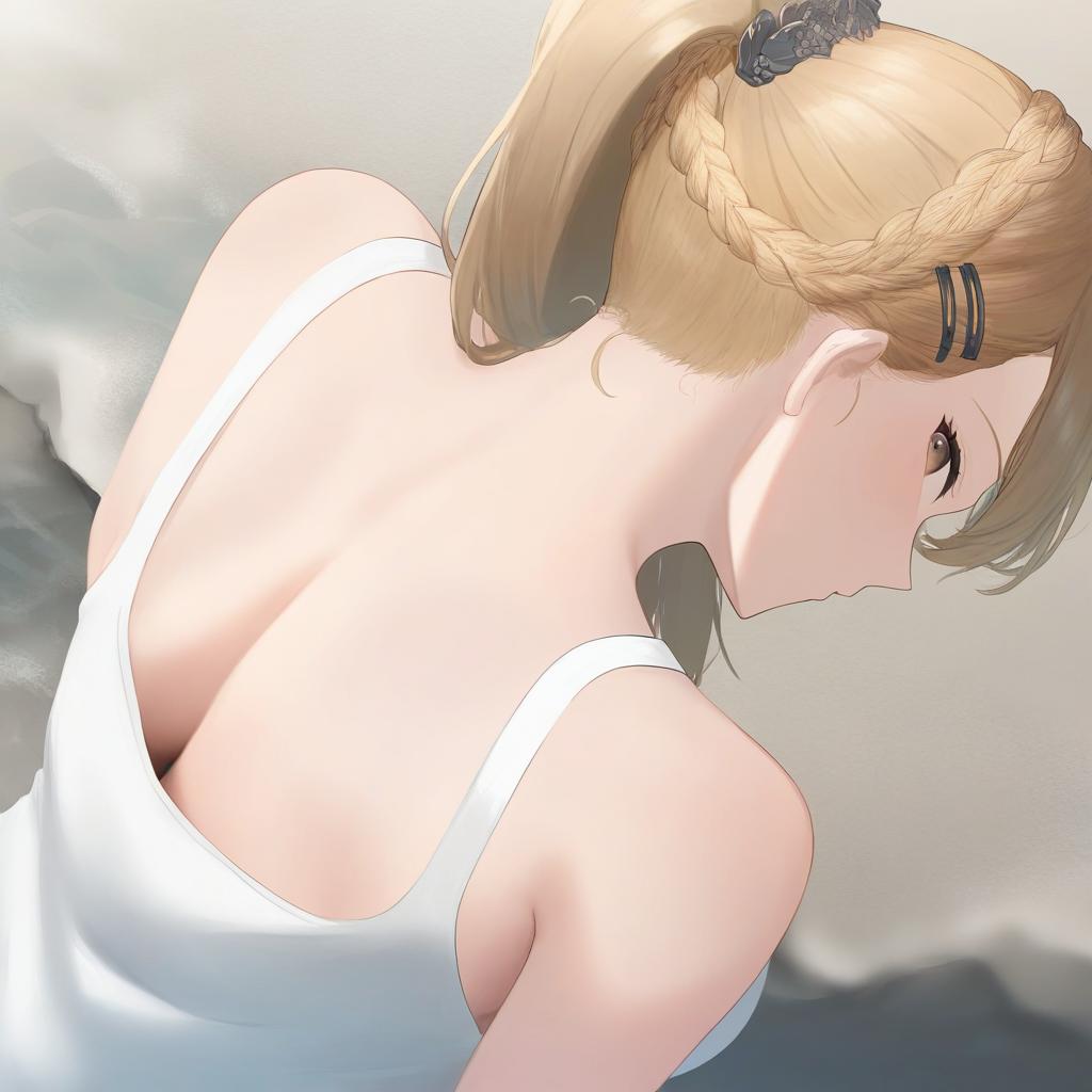 1girl, crown braid, brown eyes, chestnut blonde, hair ornament, ponytail, hairclip, seaside cliff, large breasts, downblouse from behind, downblouse, from behind, tank top , white tank top, cleavage, from above, nape, head down, looking at viewer, looking back, looking up, sideways glance
