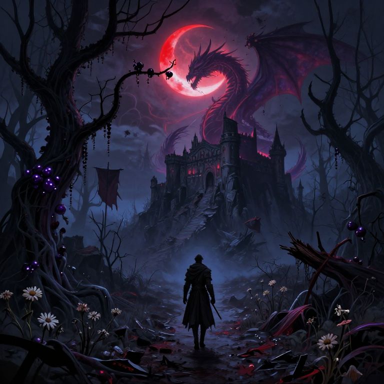 In a cyberpunk-inspired realm, Theme: Futuristic, cyberpunk-inspired tarot deck The Moon: A figure, walking through a dark, foggy forest, is haunted by ghostly apparitions, The background is the silhouette of a dragon emerges from the darkness, its form composed of the same vibrant energy, The entire scene is bathed in a contrast of deep blacks and brilliant pinks, creating a dynamic and visually striking composition, Particles of light scatter through the air, adding to the mystical atmosphere, This digital illustration blends elements of anime artistry with futuristic aesthetics, resulting in a captivating image that radiates energy and intensity