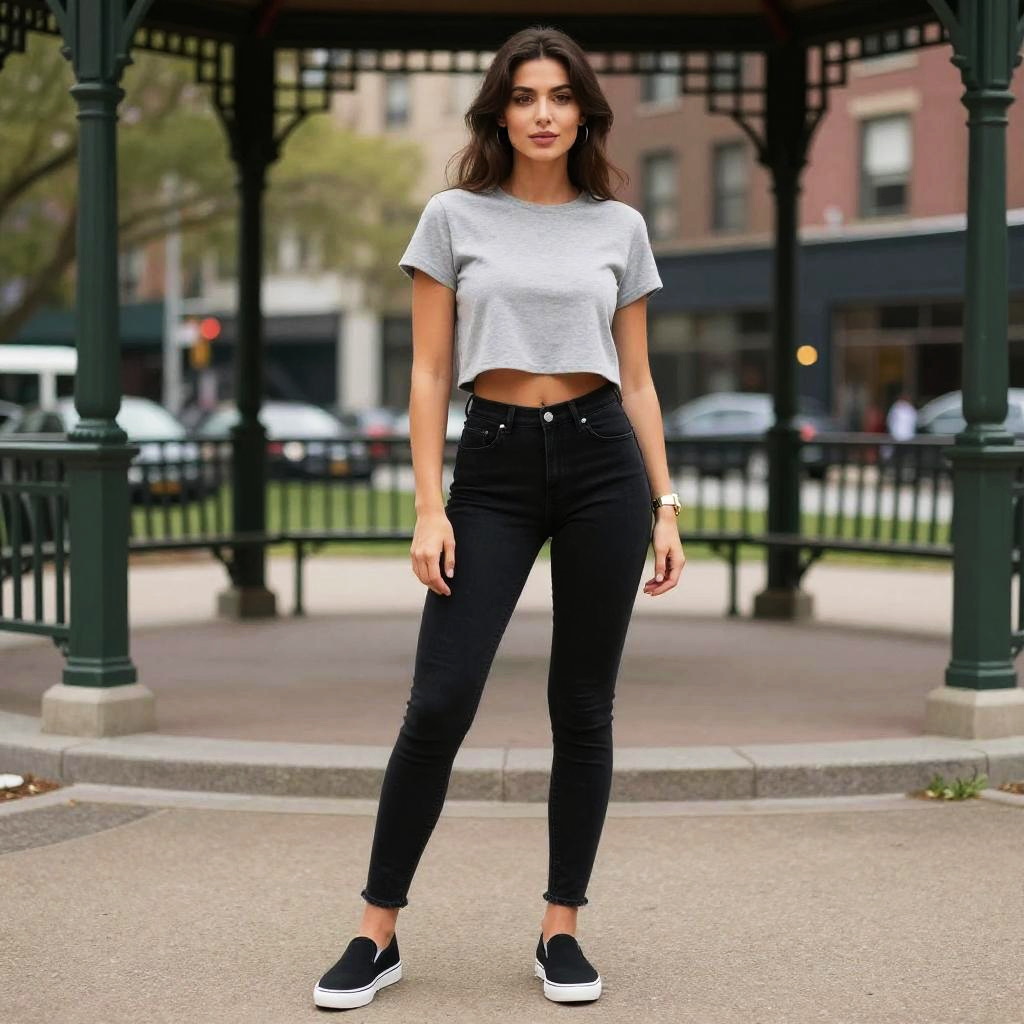 A slim woman, in a casual chic style reminiscent of One Piece books, wearing a heather grey scoop neck t-shirt tucked into white patterned tapered trousers, paired with black ankle boots. She stands in a city rooftop lounge area, surrounded by a vibrant skyline. Sexy. Pretty face and beutiful eyes