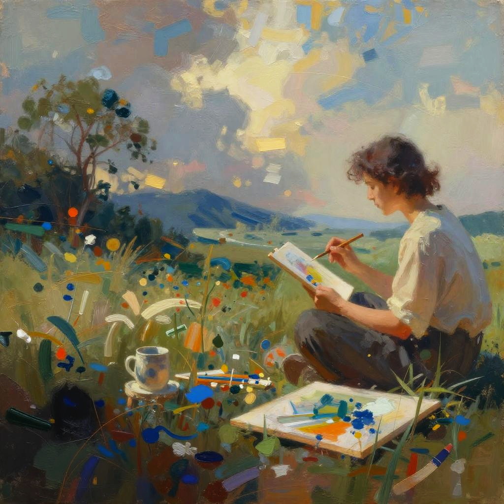 Replace image idea illustrating a surreal scene where a giant frame is hanging in mid-air, an artist using a brush to erase and replace the picture inside with a colorful landscape, fantasy style, dreamy lighting, vivid colors and fluid motion effect.