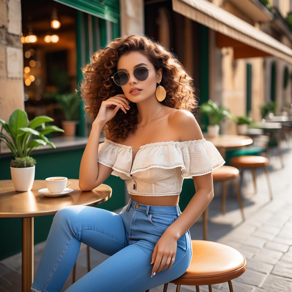 4K glamour photography of a charismatic 26-year-old Italian fashion influencer, sitting on a chic cafe terrace, in a stylish pose. She has long curly chestnut hair, and wears a trendy off-shoulder top and high-waisted jeans. The composition features oversized sunglasses, vibrant colors, captured in a low-angle portrait shot emphasizing realism and vibrant details with professional lighting.