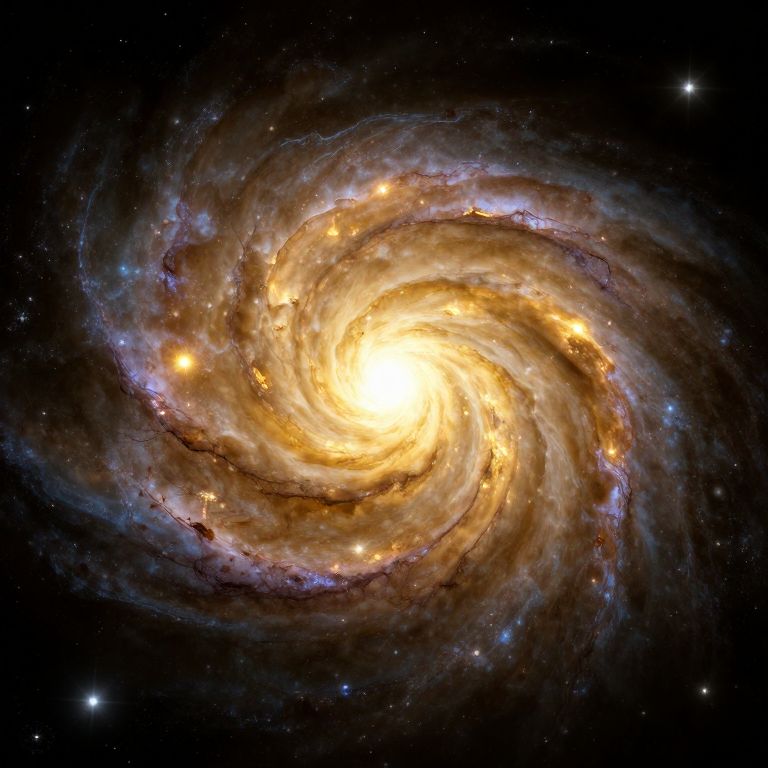 A mesmerizing 3D render captures a vibrant spiral galaxy bathed in golden hues, set against a star-studded cosmic backdrop, evoking a sense of awe and wonder through its dramatic lighting and high-definition detail.