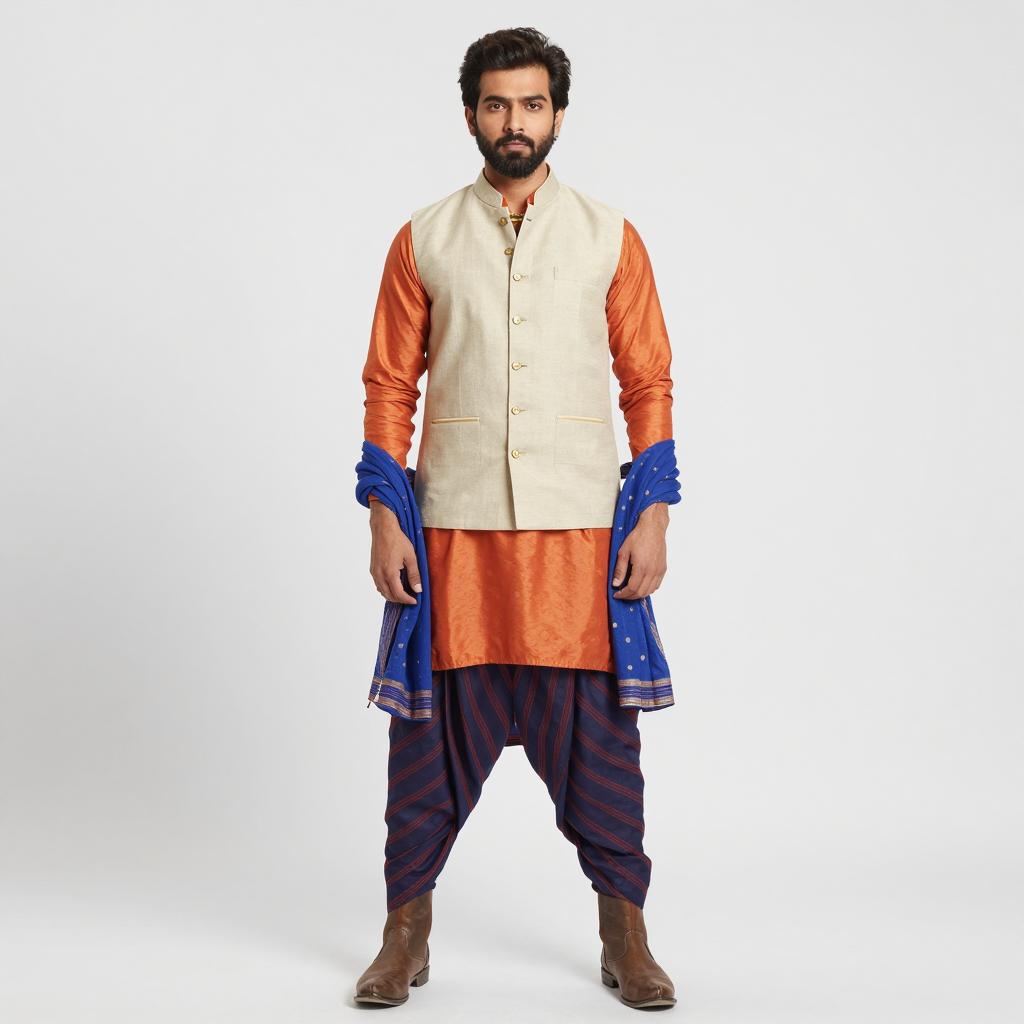 Full-body portrait of a handsome Indian man with dark hair and beard wearing a beige vest over an orange long-sleeve kurta paired with dark blue and red striped dhoti pants. He has a blue shawl draped over his arms and is wearing brown boots and a gold necklace. The man stands against a plain white background with a serious expression, styled in a casual yet stylish Bollywood theme costume.