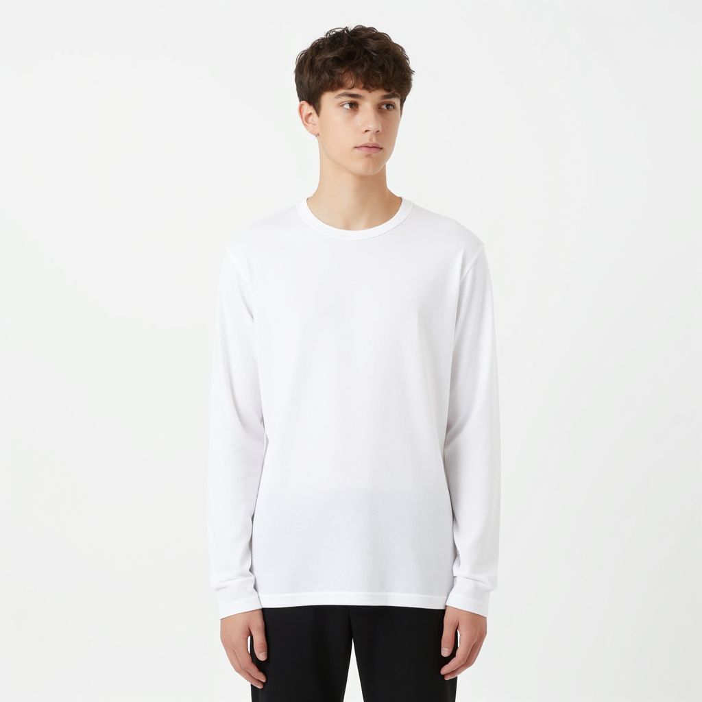 This is a digital photograph of a young man with short, dark brown hair and light skin. He's wearing a plain white long-sleeve shirt and black pants. He's standing against a completely white background, making him the focal point. His expression is neutral, and he's looking slightly to the right. The image has a clean, minimalist look with no additional objects or textures.