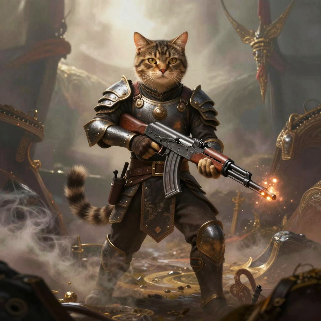 Cat with AK47, cyberpunk street scene, neon lights reflecting off sleek fur, futuristic cityscape background, detailed weapon, glowing eyes, sci-fi style, vibrant hues, action ready