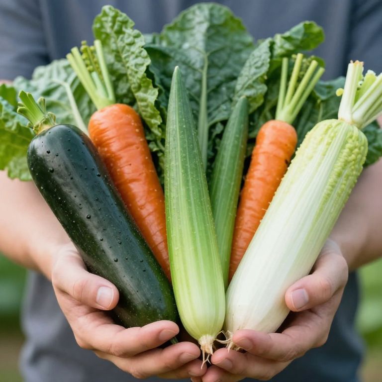 Eric Carle a person holding a bunch of fresh vegetables, close-up composition with a natural style, smooth texture, angular or pointed shapes, and a bright and fresh color palette - Upscaled by,