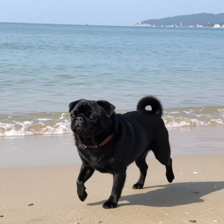 Photograph of a black pug with a curled tail, wearing a brown collar, walking on a sunny beach with gentle waves and a distant coastline in