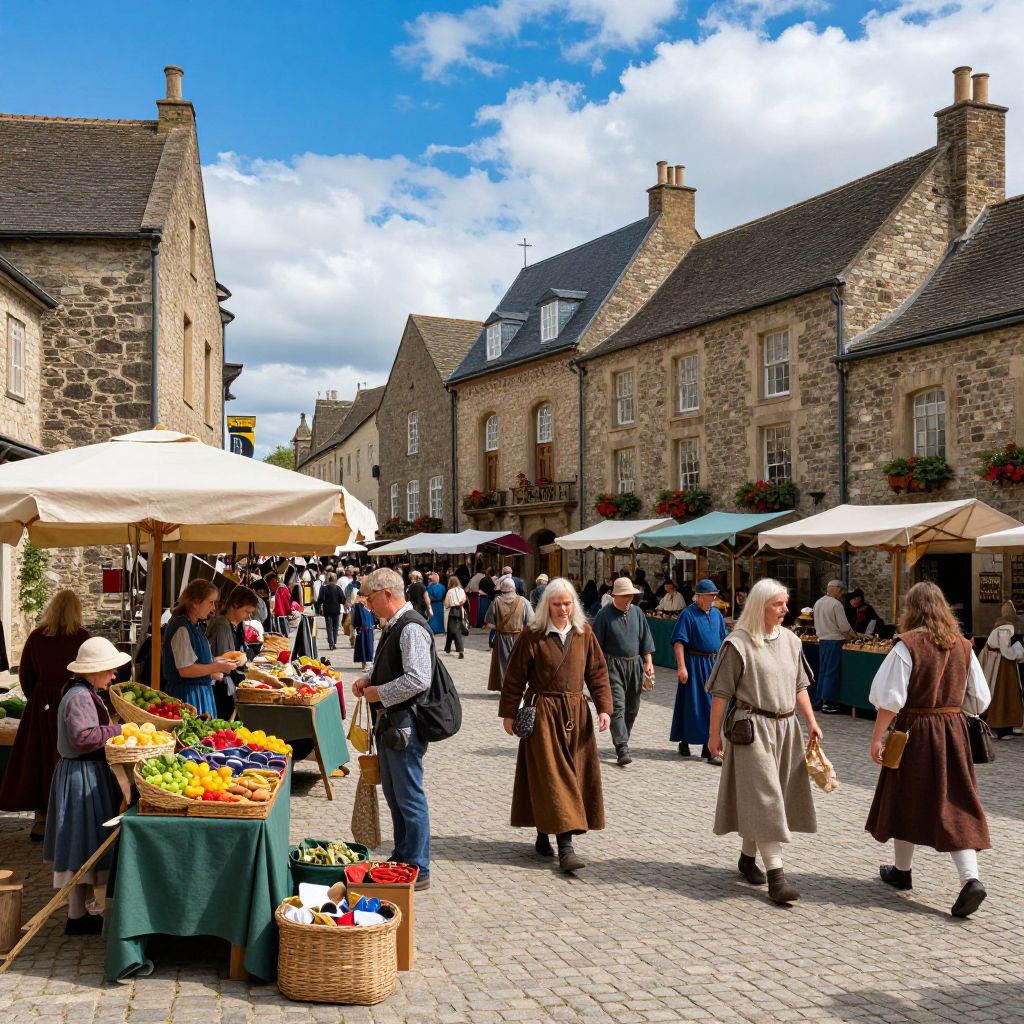 Photograph of a bustling outdoor market in a quaint European village. The cobblestone street is lined with stone buildings featuring slate roofs and flower boxes. Market stalls with white canopies display colorful fruits, vegetables, and crafts. Shoppers, mostly dressed in casual to medieval-style clothing, walk among the stalls. The sky is bright blue with fluffy white clouds. The crowd includes elderly individuals and families, adding to the lively atmosphere. The image captures the charm and vibrancy of the market, with a mix of historical and modern elements.