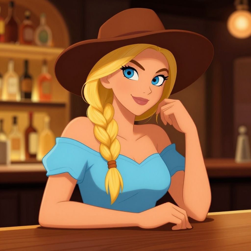 A digitally illustrated woman with striking blue eyes and long blonde braid leans on a wooden bar counter, wearing a wide-brimmed brown hat and a light blue off-shoulder top. The animated style artwork features vibrant colors and detailed shading, set against a backdrop of illuminated shelves filled with bottles.