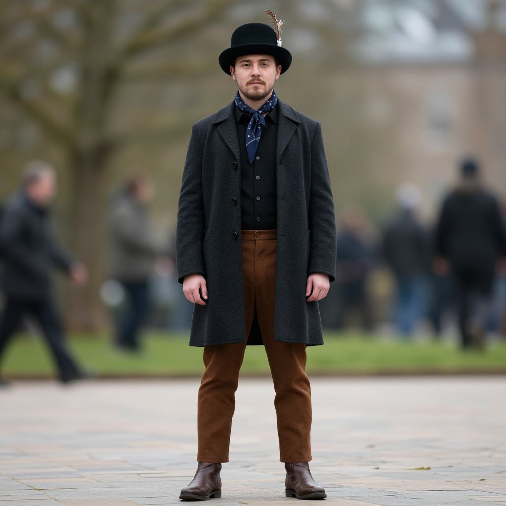 Photograph of a Caucasian man with a trimmed beard and mustache, standing outdoors on a paved area. He wears a black top hat with a small feather, a dark navy blue patterned scarf, a long black overcoat, brown trousers, and brown leather shoes. The background is blurred, featuring several indistinct people and leafless trees. The man stands centrally, looking directly at the camera with a neutral expression. The overall tone is muted, with a mix of dark and brown colors contrasting with the slightly overcast, blurred background. The image has a slightly humorous, quirky feel.