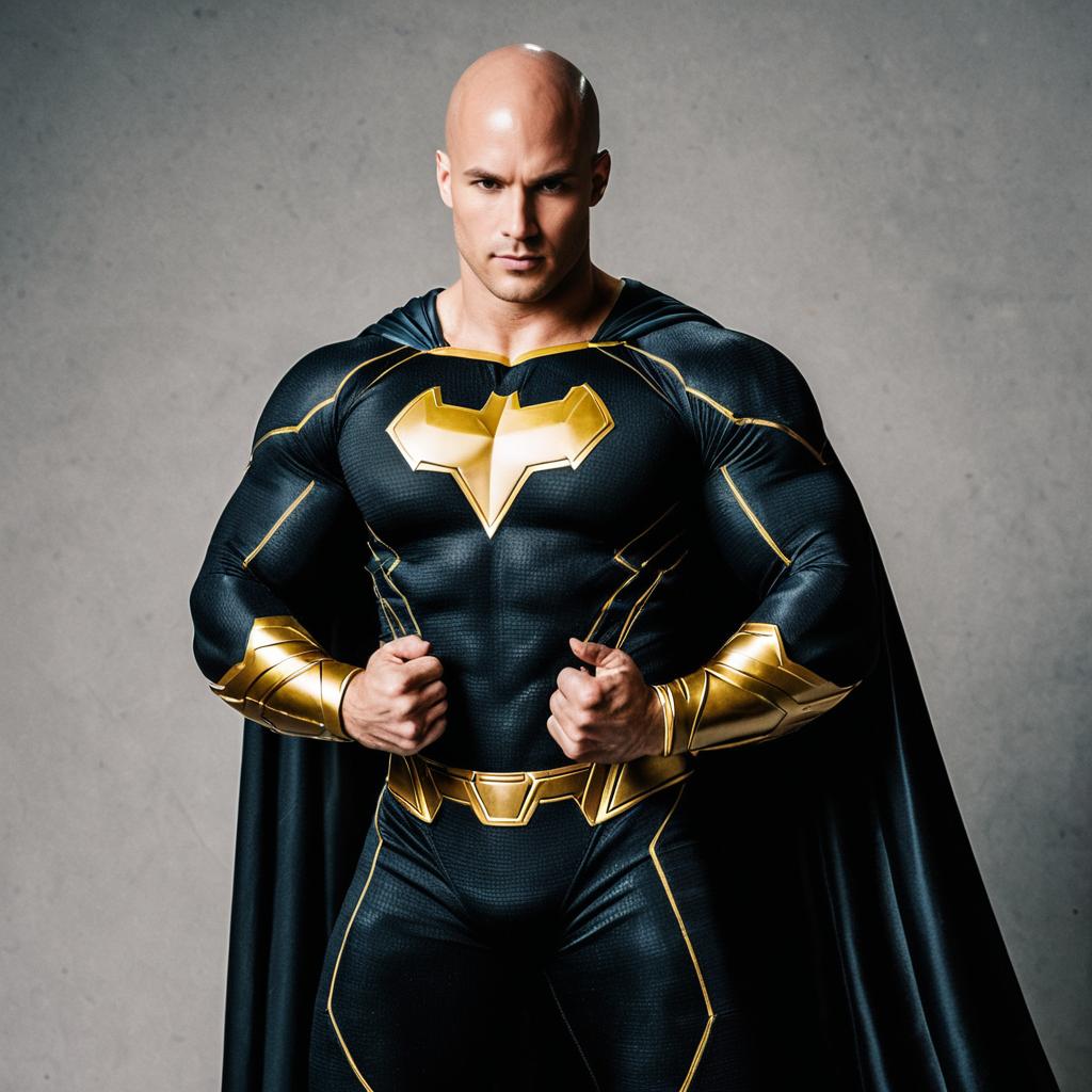 Bald man halloween costume, photograph of bald, muscular man, standing, looking directly at camera, wearing black long-sleeve shirt with bat-like shoulder pads, black belt, concrete wall background, serious expression, studio lighting, realistic, dark, mysterious, supernatural, fantasy, detailed ures, high contrast, high detail