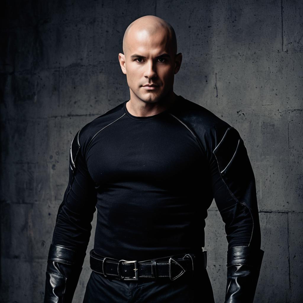 Portrait of a bald, muscular man wearing a black long-sleeve shirt with bat-like shoulder pads and a black belt. He stands against a textured concrete wall background with a serious expression, illuminated by dramatic studio lighting. The image has a dark, mysterious atmosphere with high detail and contrast, fitting supernatural or fantasy themes.