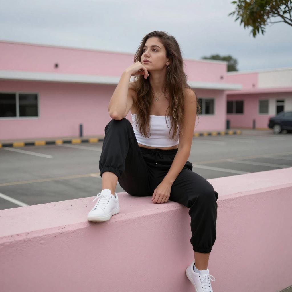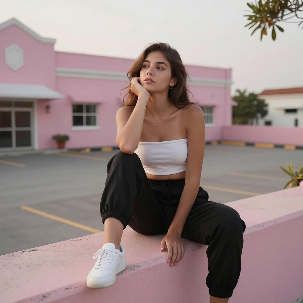 Photograph of a young woman with long brown hair, sitting on a pink concrete ledge. She's wearing a white strapless top, black jogger pants, and white sneakers. She's leaning back with one hand on her chin, looking thoughtful. Behind her is a pink building with white trim and a parking lot. The sky is dusky, and a tree branch is visible in the top right corner.