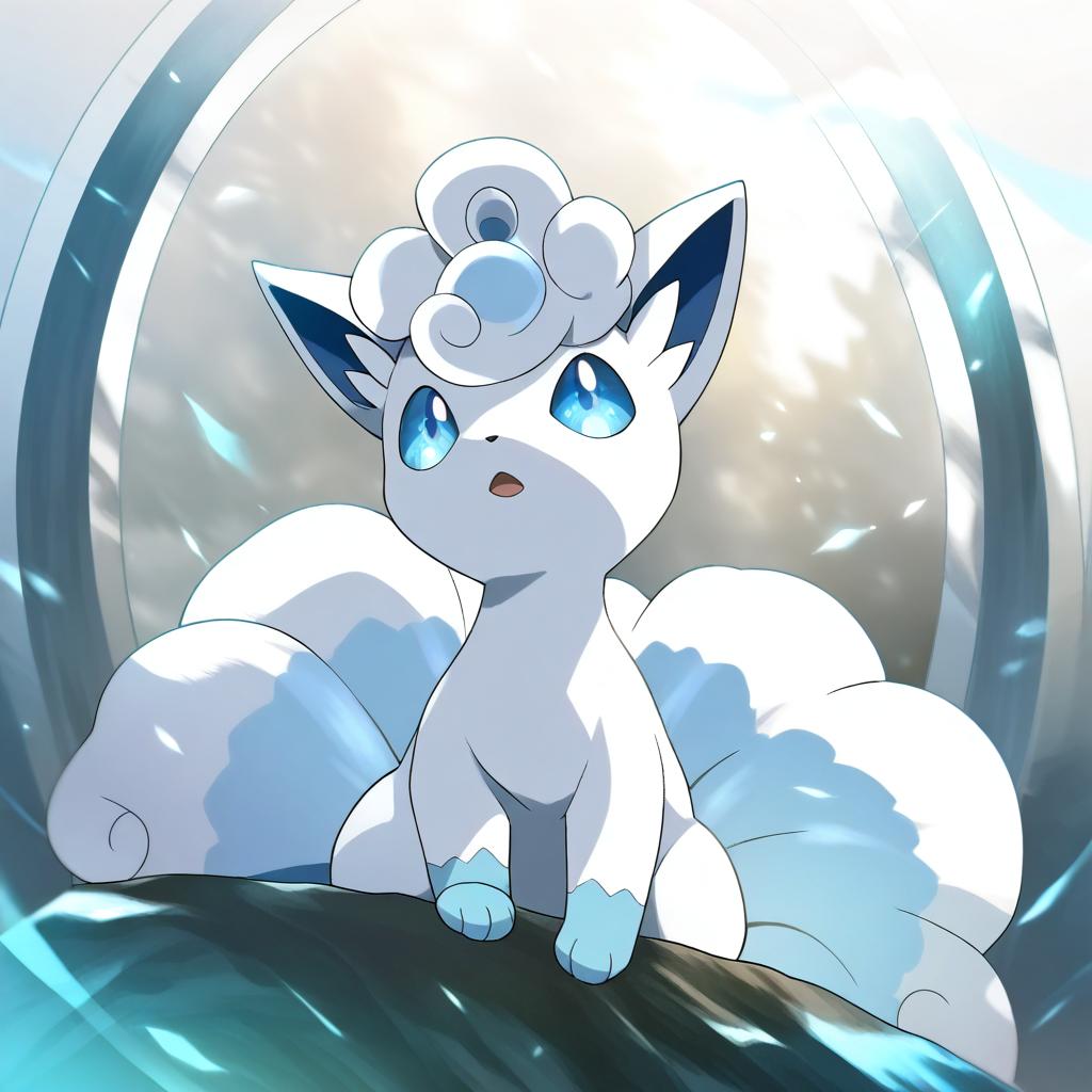 Alolan vulpix, pokemon, no humans, fox ears, fox tail, blue eyes, short hair, white hair, pokemon (creature), white fur, two-tone fur, body fur, by artist mitarashi kousei, animagine