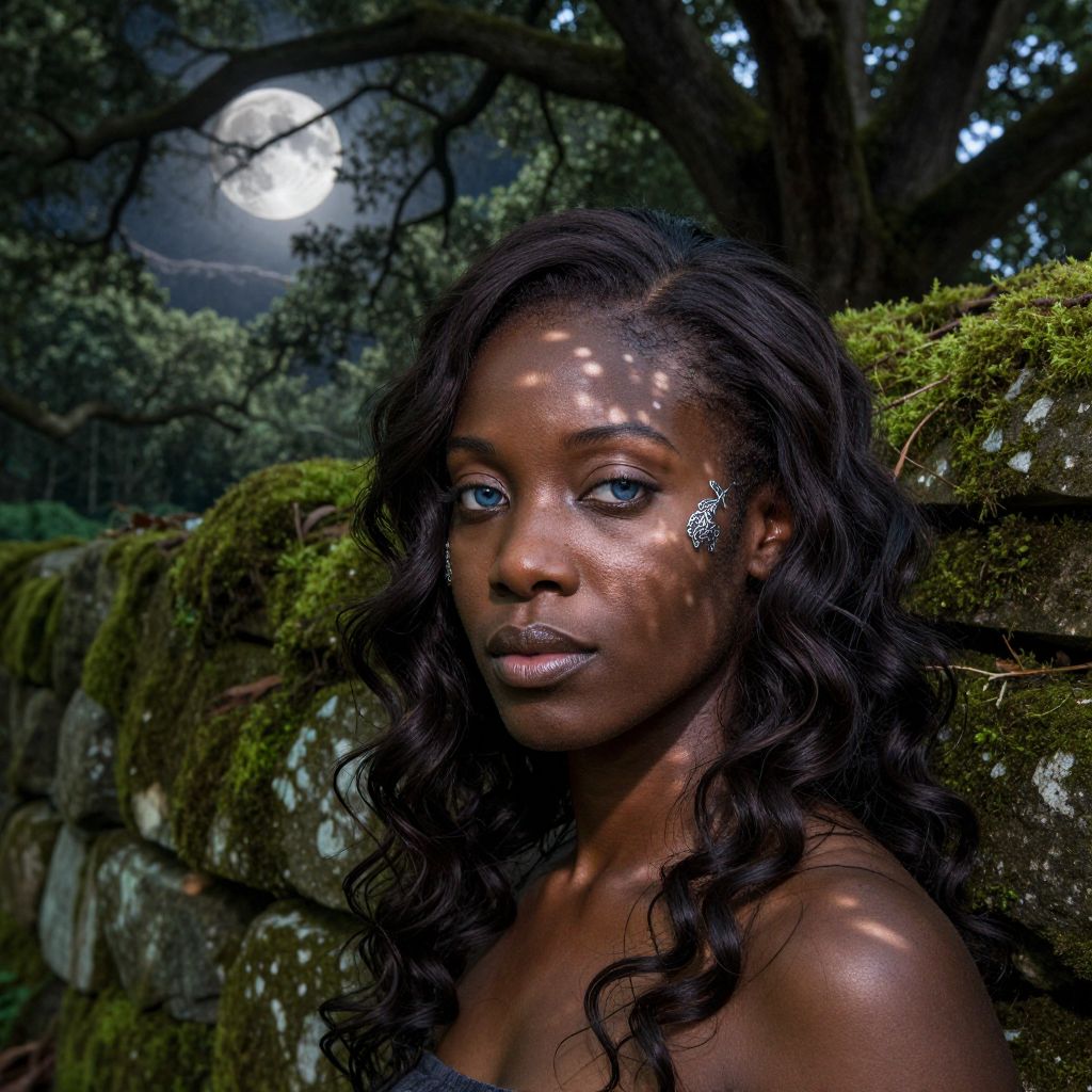 Craft a highly realistic portrait of an enigmatic African woman with porcelain-like skin, cascading dark waves framing her face, and delicate silver filigree adorning her features. Her calm blue eyes exude strength and wisdom, while a subtle smile hints at untold tales. From above, ethereal moonlight filters through the ancient tree canopy, casting dancing shadows upon her serene countenance as she leans against a moss-covered stone wall in a dreamlike forest setting, creating an intriguing blend of beauty and mystery.