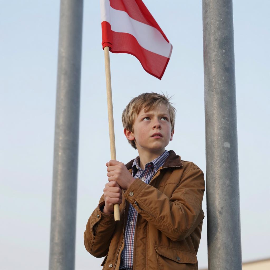 Young boy with light brown hair, wearing a brown jacket over a checkered shirt, holding a red and white striped flag with wooden sticks. He is between two gray metal poles, looking up with an intense expression. Background is a clear sky.